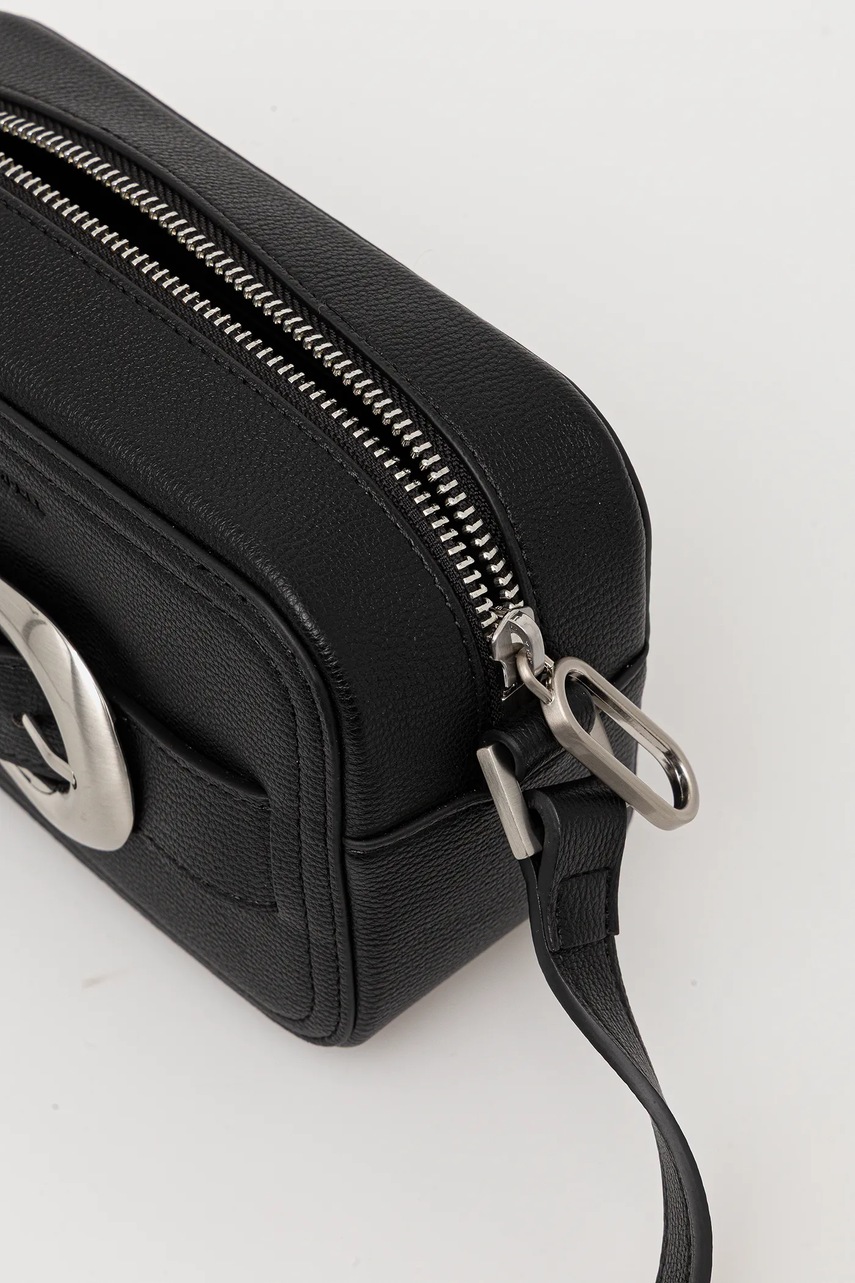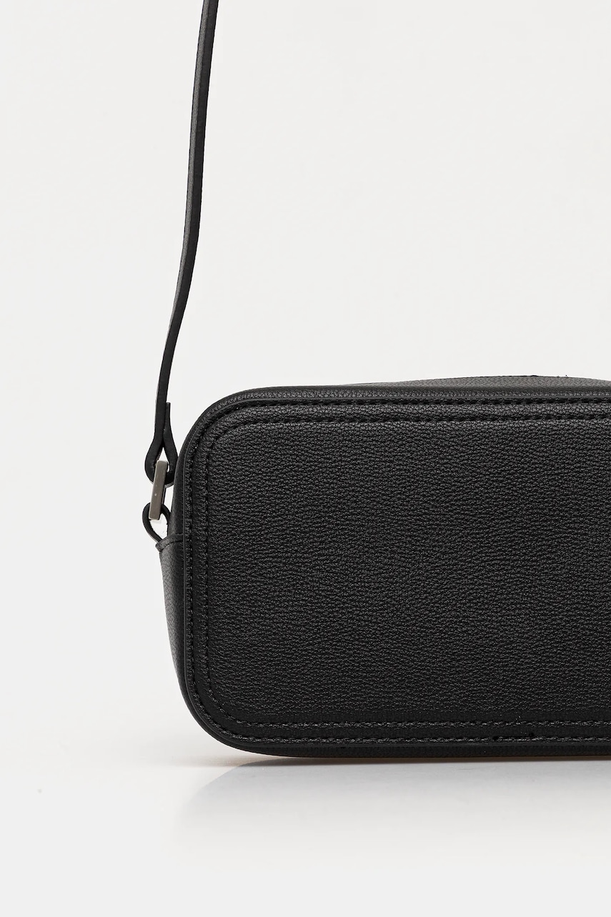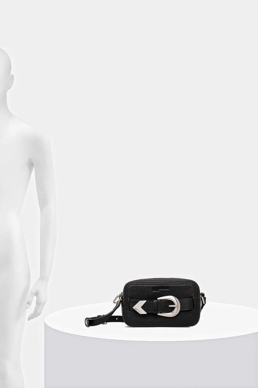 - Zapięcie na suwak. - Ozdobna klamra. - Wsuwana kieszeń wewnętrzna. - Nieodpinany pasek z regulacją. - Długość minimalna paska: 111 cm. - Długość maksymalna paska: 127 cm. - Głębokość: 7 cm. - Wysokość: 11 cm. - Szerokość u podstawy: 18 cm.