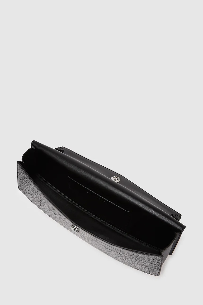 - Klapa zapinana na magnes. - Krótkie uchwyty dla komfortowego noszenia w dłoni. - W komorze głównej dwie przegrody. - Nie mieści formatu A4. - Wysokość: 15 cm. - Szerokość u podstawy: 36 cm. - Głębokość: 7 cm.