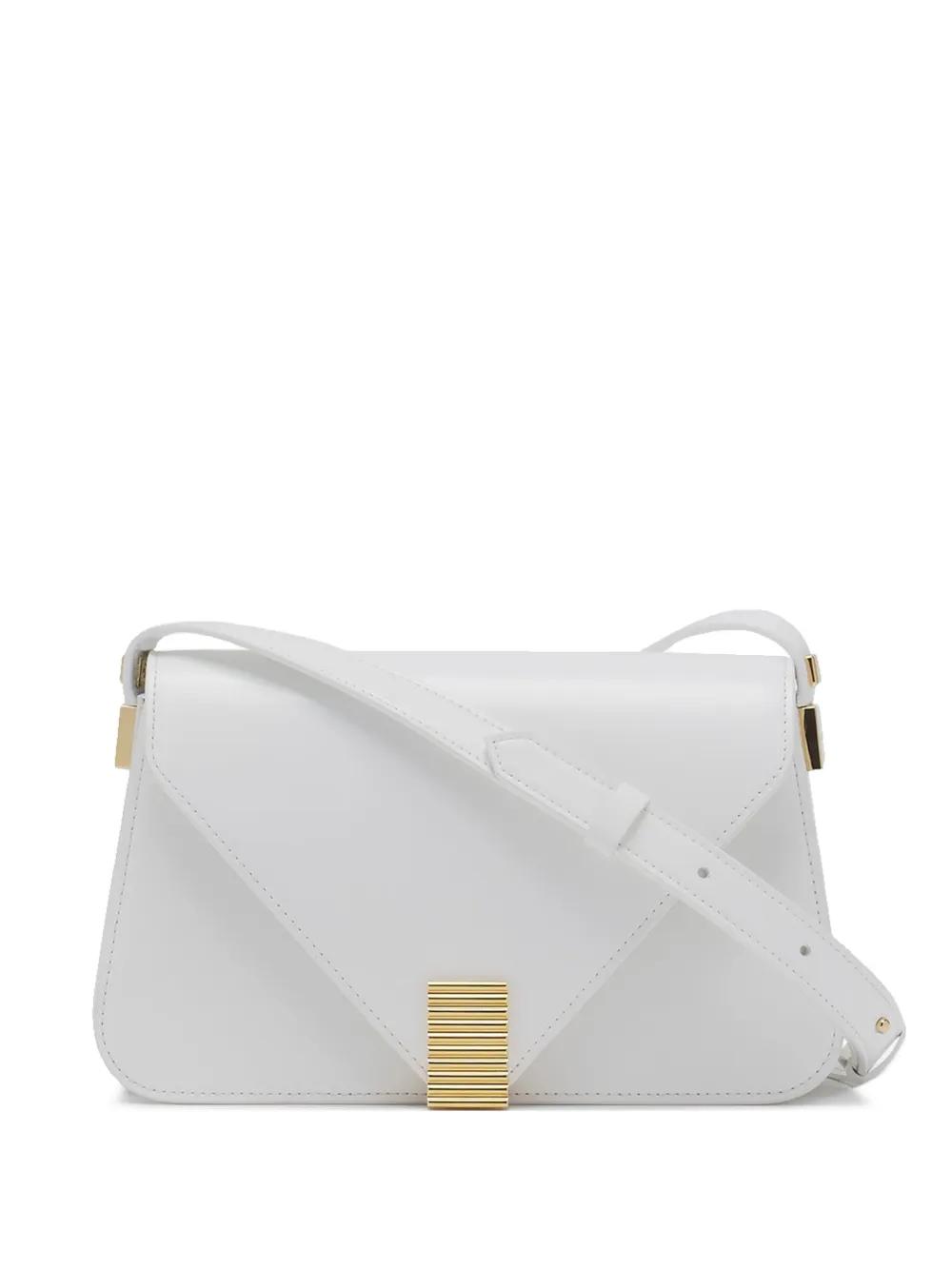 white logo lettering foldover top clasp fastening single top handle gold-tone hardware adjustable shoulder strap