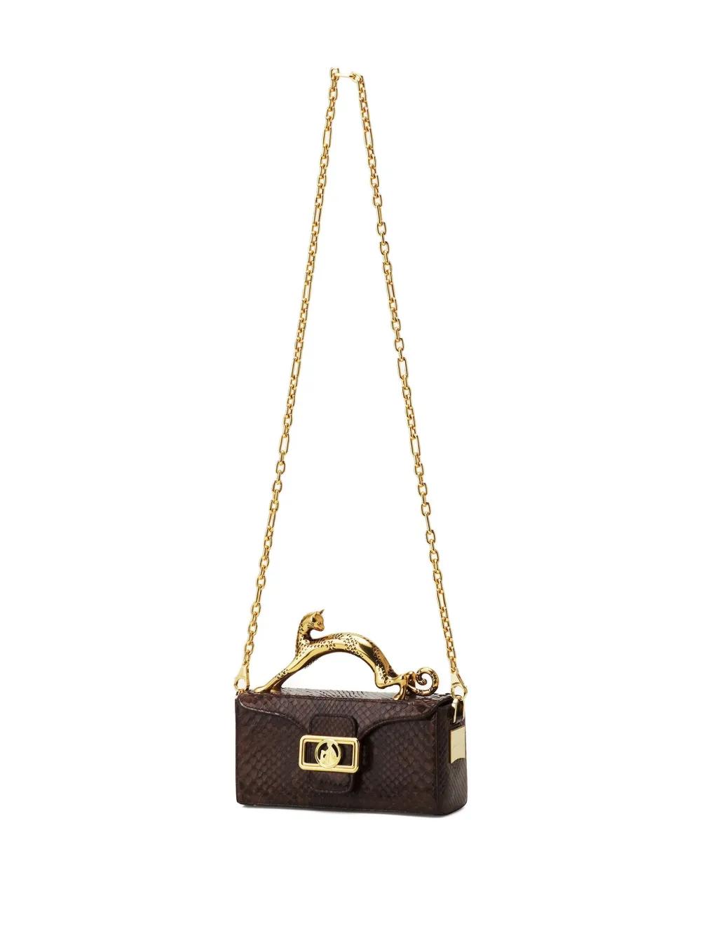 brown python print cat-shaped top handle gold-tone hardware rectangular plaque chain shoulder strap