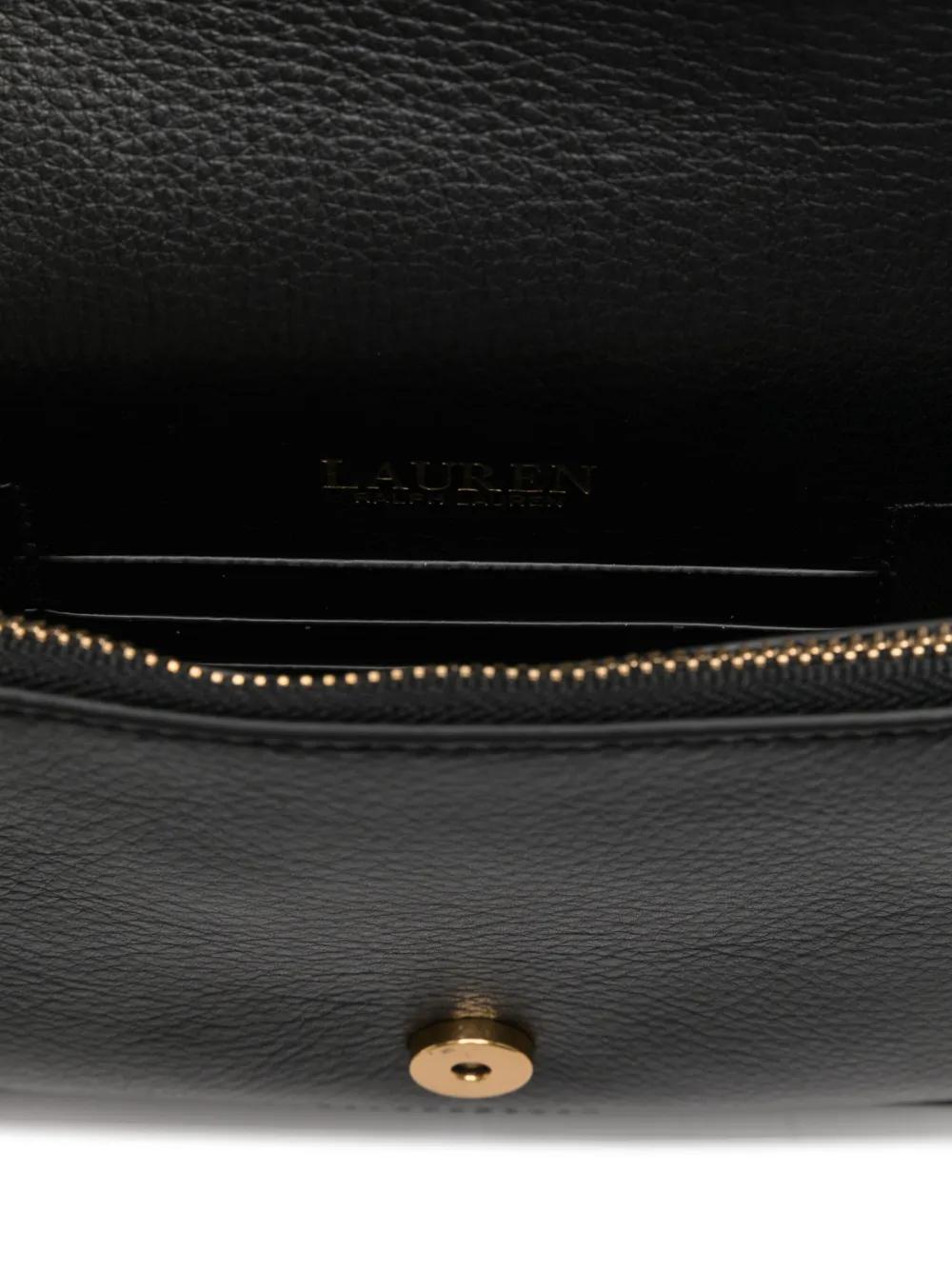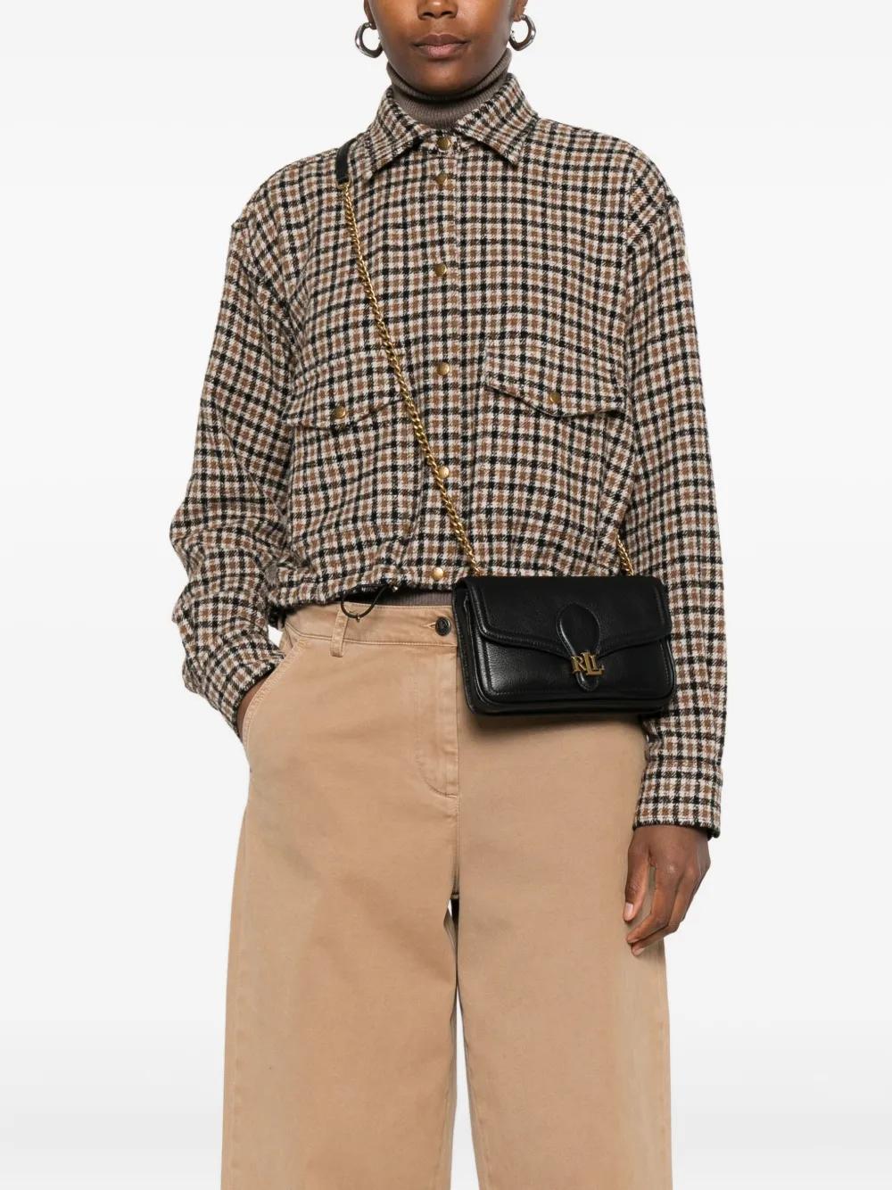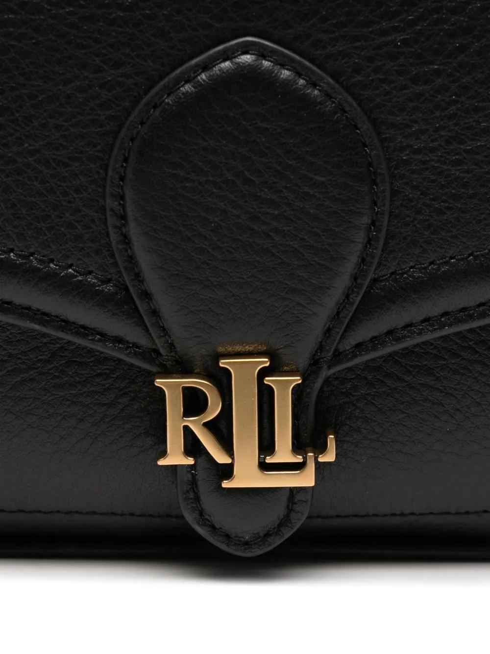 black leather construction gold-tone logo flap closure chain strap zip fastening