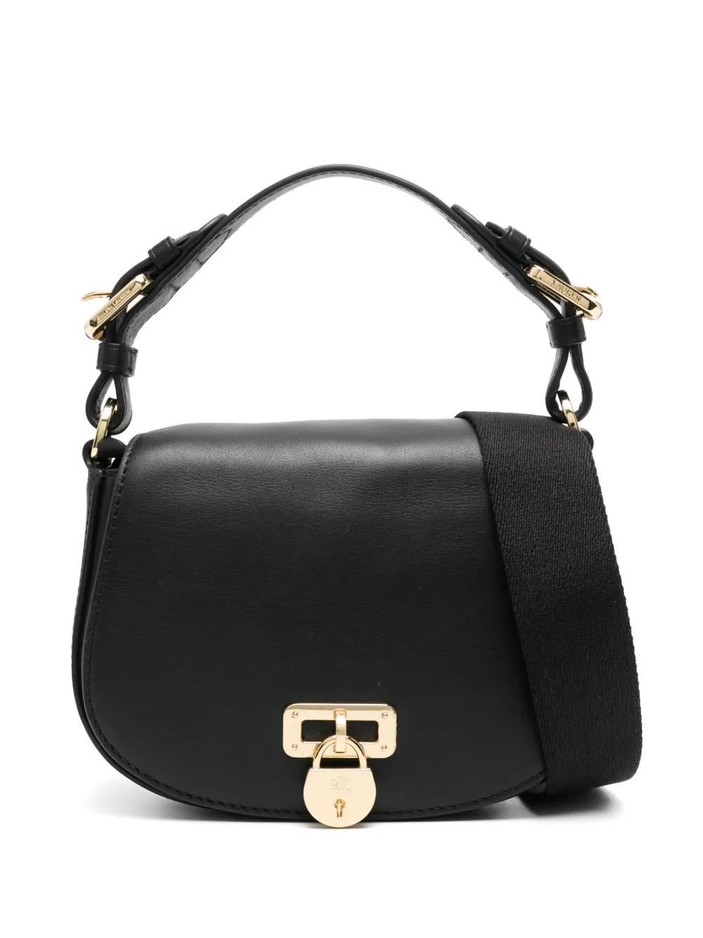 black calf leather smooth grain adjustable detachable shoulder strap single detachable top handle decorative padlock detail to the front slip pocket to the rear main compartment internal slip pocket internal logo plaque full lining gold-tone hardware foldover top with concealed magnetic fastening