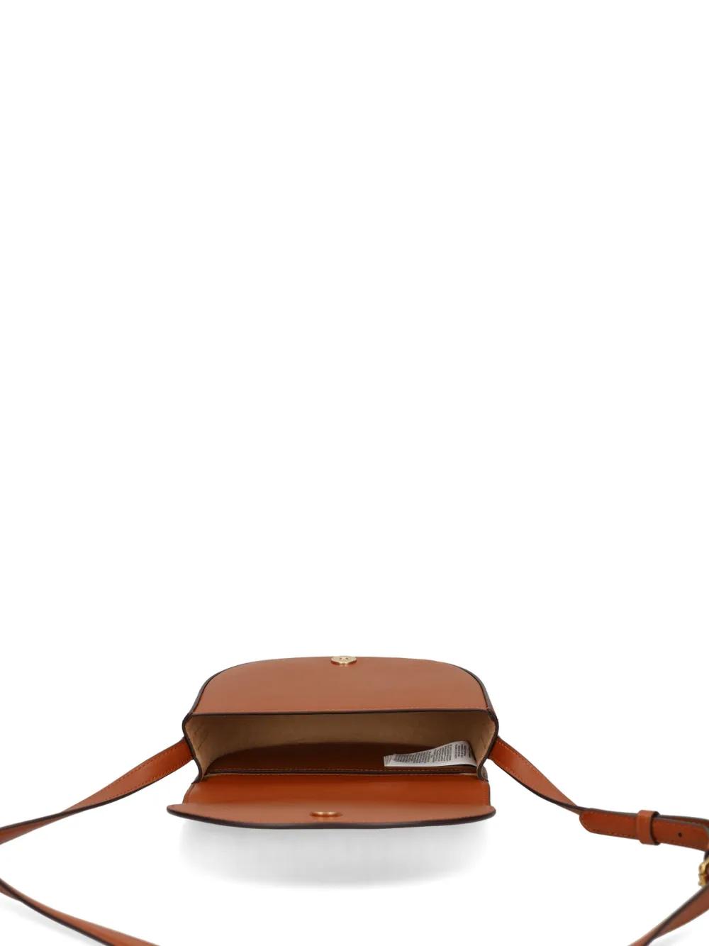 auburn brown leather embossed logo to the front foldover top with magnetic fastening main compartment adjustable shoulder strap