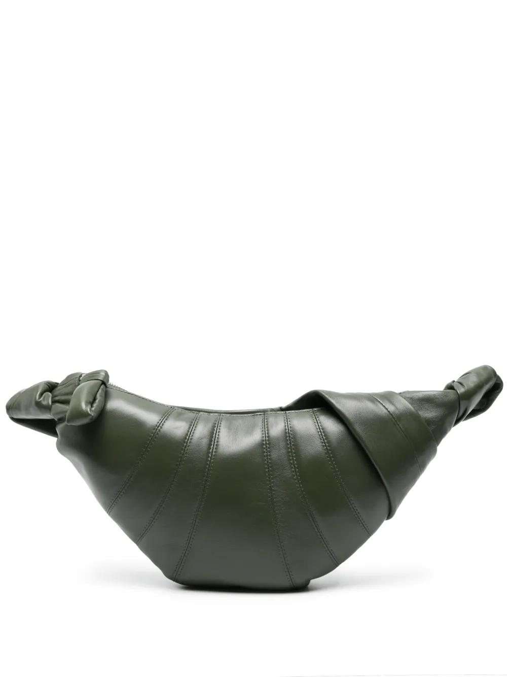 dark green lambskin smooth grain panelled design single shoulder strap knot detailing main compartment internal slip pocket internal logo patch cotton-canvas lining top zip fastening This piece comes complete with a protective dust bag. Although it is new and unworn, due to the specialised recovery and tanning process that Lemaire uses for its leather goods, the texture of this piece will display signs of the material's natural grain, softness and creases.