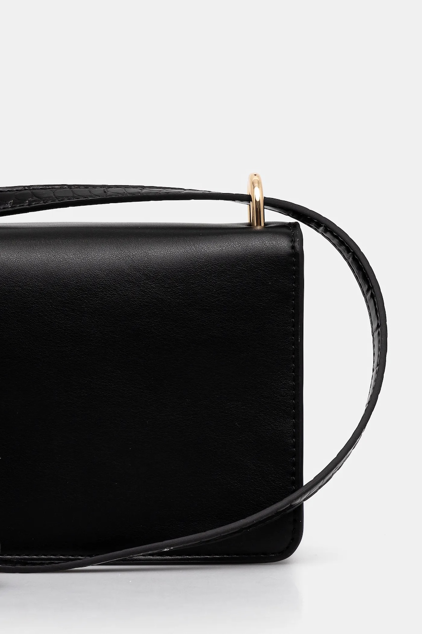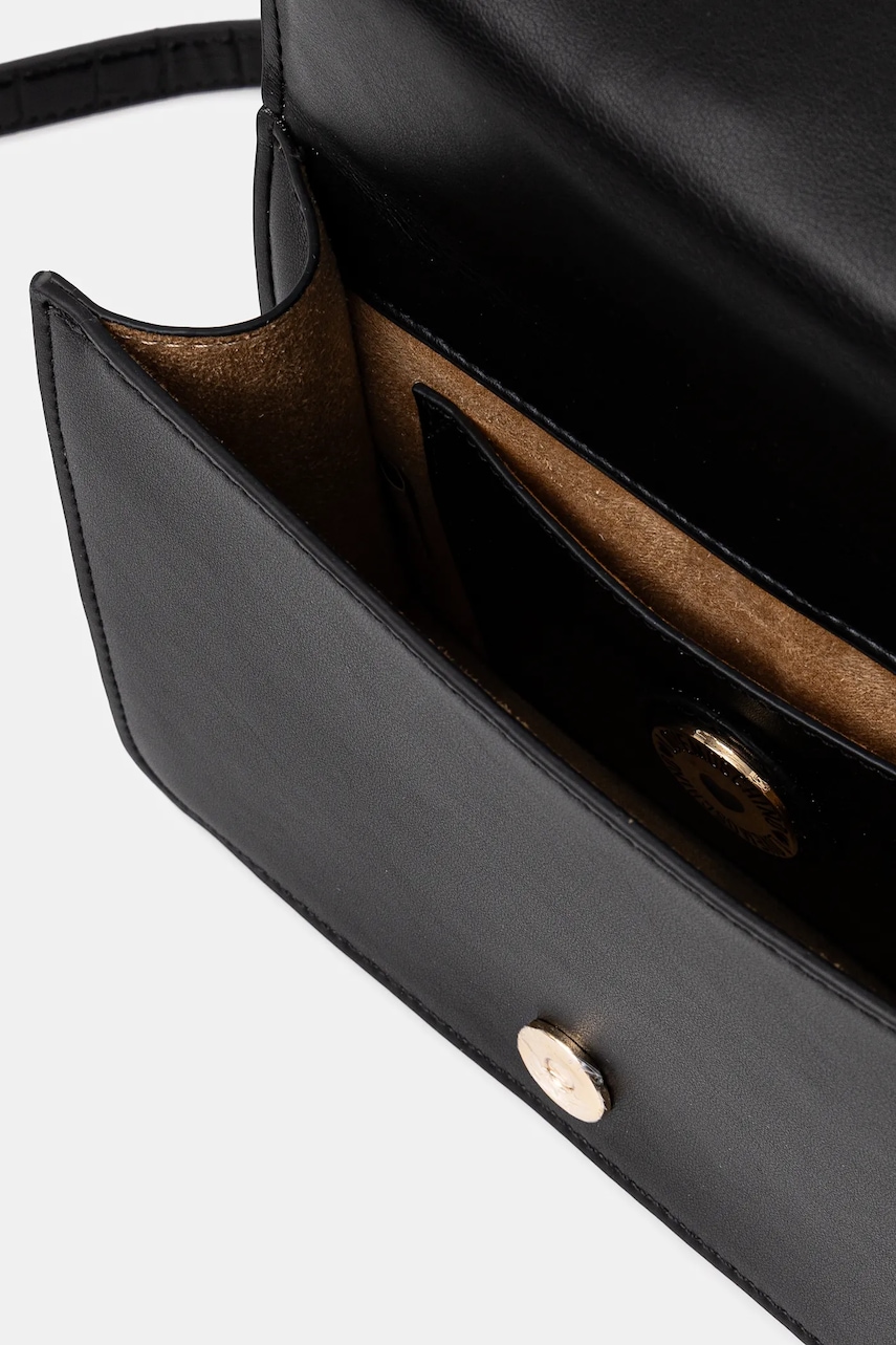 - Klapa zapinana na magnes. - Model bez podszewki. - Wewnętrzna, wsuwana kieszeń, która ułatwia bezpieczne przechowywanie drobiazgów. - Torebka do noszenia w ręku lub na ramieniu. - Nieodpinany długi pasek bez regulacji. - Nie mieści formatu A4. - Dołączony tekstylny worek zabezpiecza produkt przed kurzem. - Głębokość: 7 cm. - Wysokość: 14 cm. - Szerokość u podstawy: 20 cm.