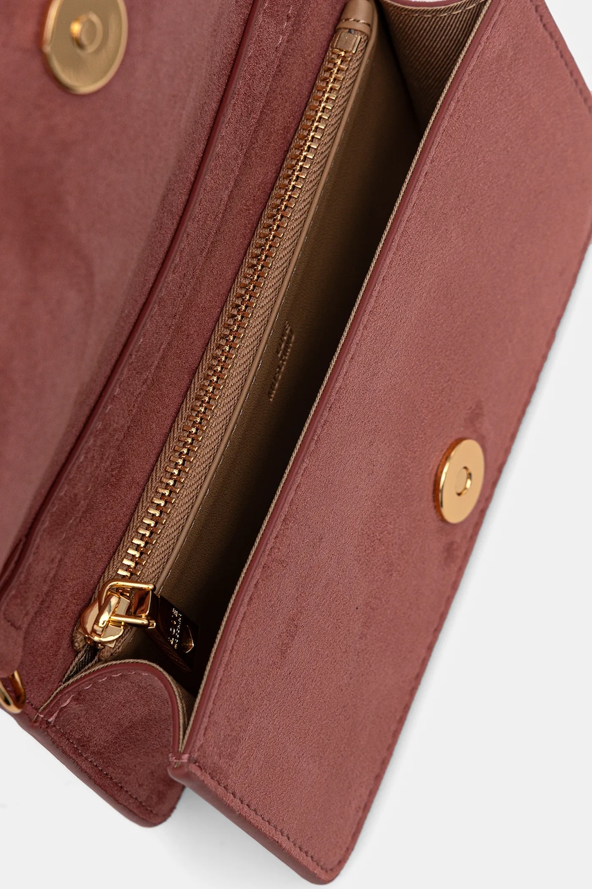 - Klapa zapinana na zatrzask. - Kieszonka wewnętrzna zapinana na suwak. - Wewnętrzne przegrody na karty. - Model z podszewką. - Nieodpinany pasek bez regulacji. - Model zapakowany w pudełko firmowe. - Długość paska: 114 cm. - Głębokość: 4 cm. - Wysokość: 8 cm. - Szerokość u podstawy: 15 cm.