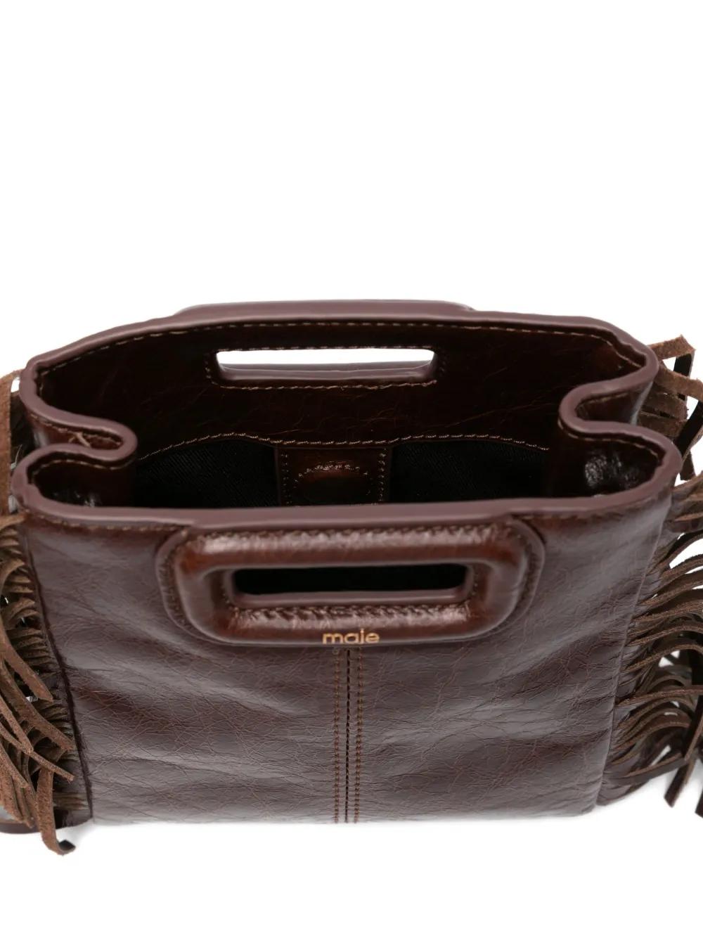 dark brown leather construction fringe detail top handle cut-out handle detail suede fringe