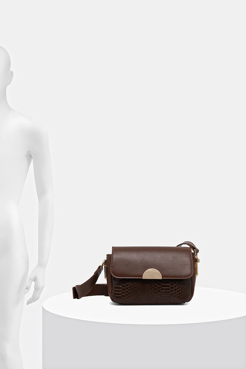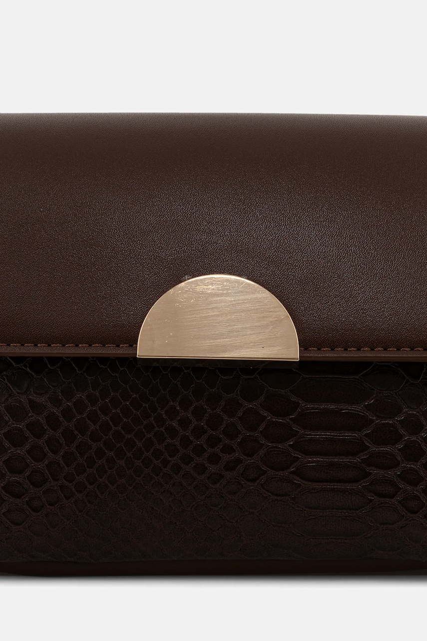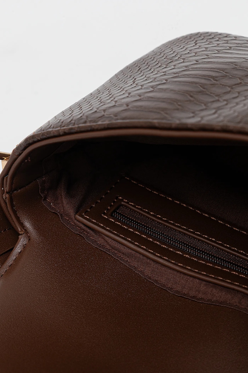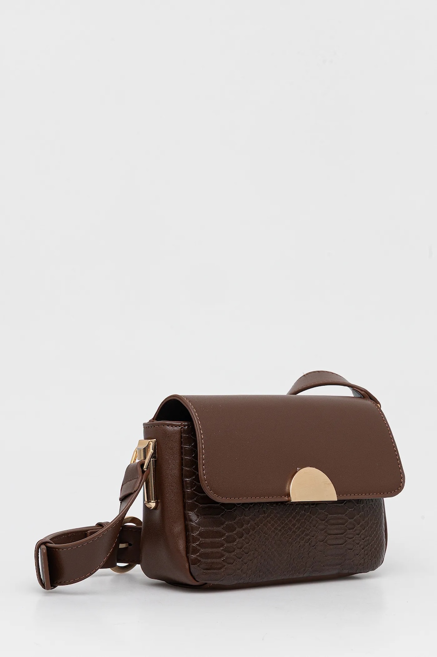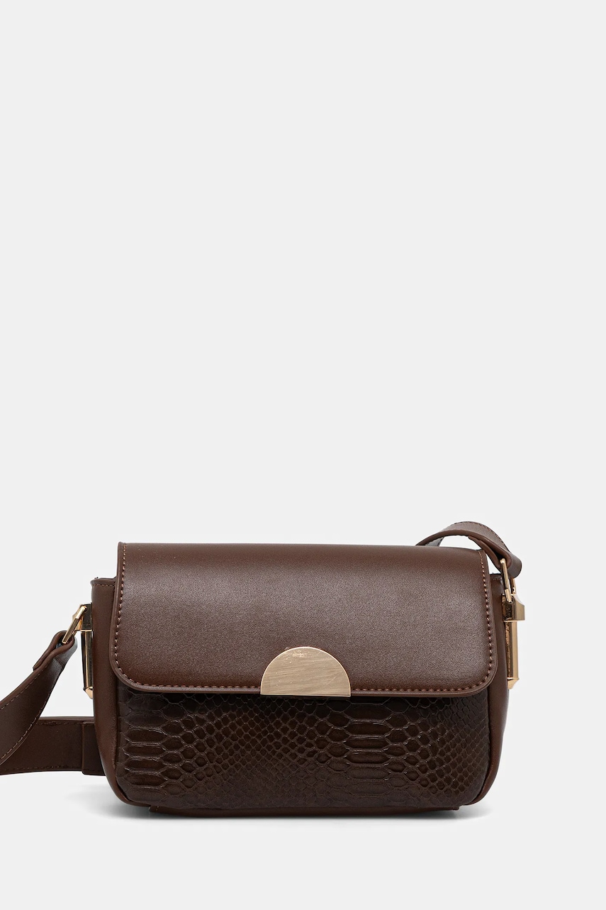 - Klapa zapinana na magnes. - Kieszonka wewnętrzna zapinana na suwak. - Nieodpinany pasek z regulacją. - Ozdobne detale. - Model z wstawką o fakturze zwierzęcej skóry. - Model z podszewką. - Nie mieści formatu A4. - Głębokość: 7 cm. - Wysokość: 14 cm. - Szerokość u podstawy: 20 cm.
