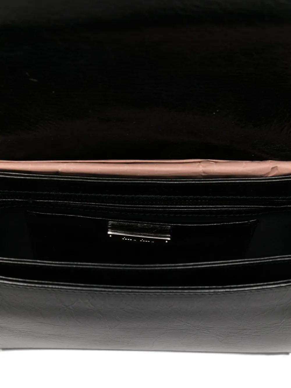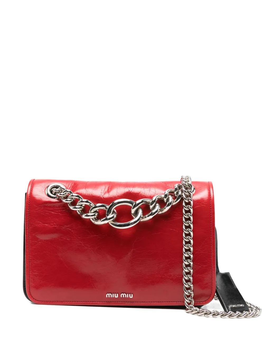 red leather chain-link shoulder strap flap closure silver-tone hardware logo detail