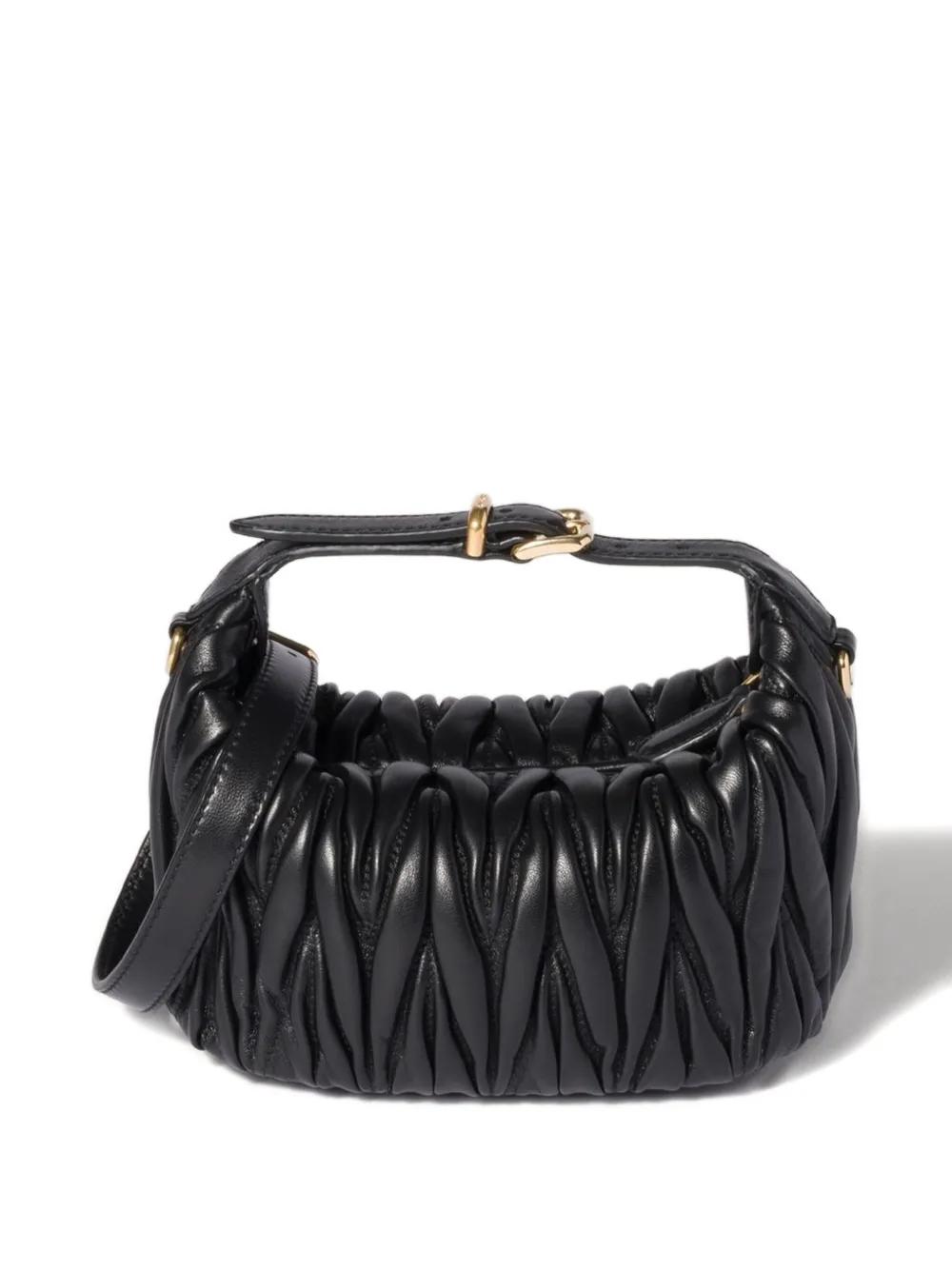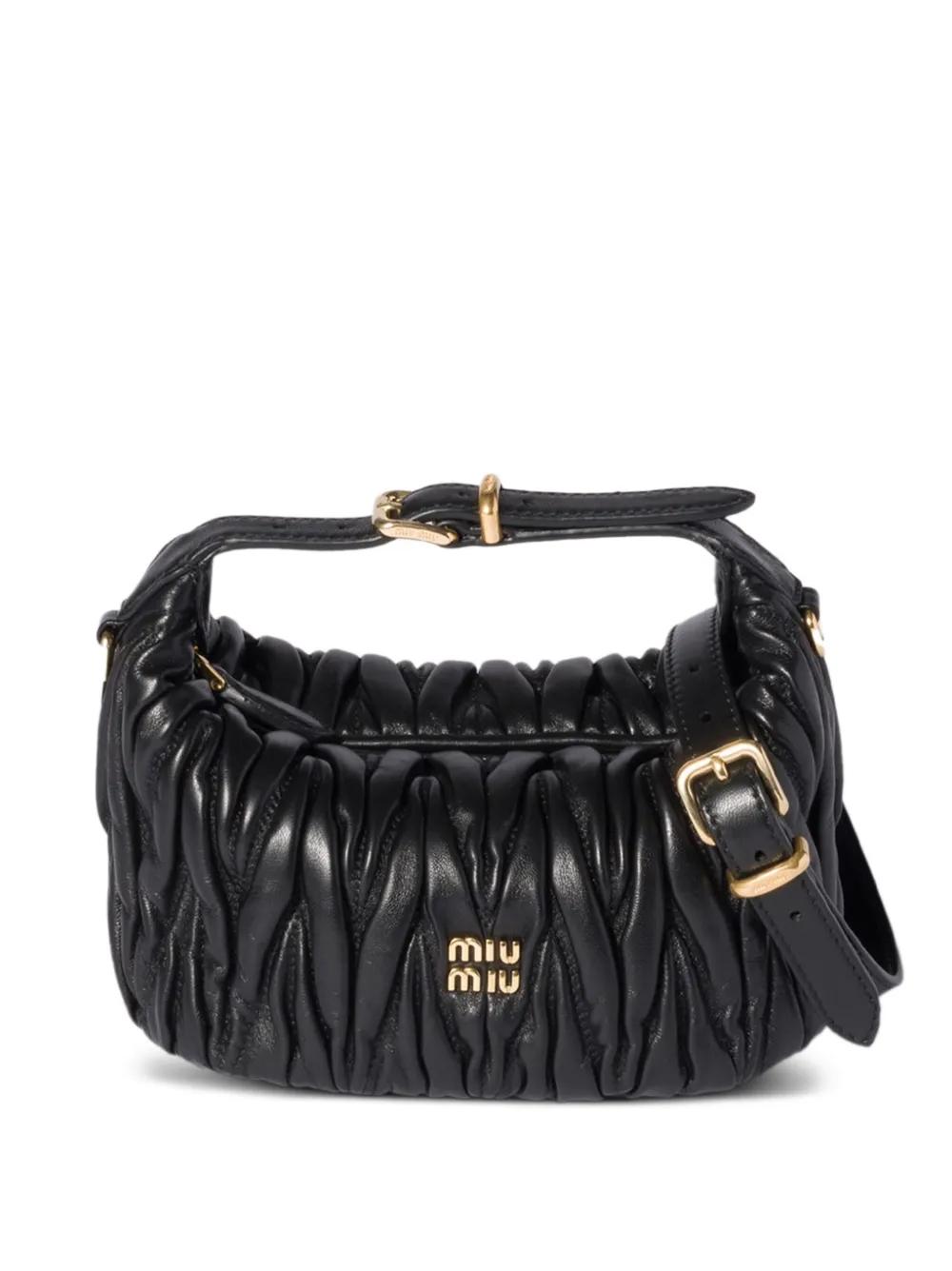 black matelassé effect adjustable detachable leather handle zip closure golt-tone lettering logo leather strap
