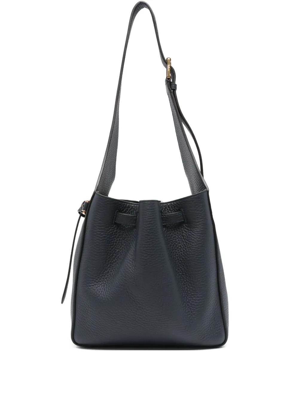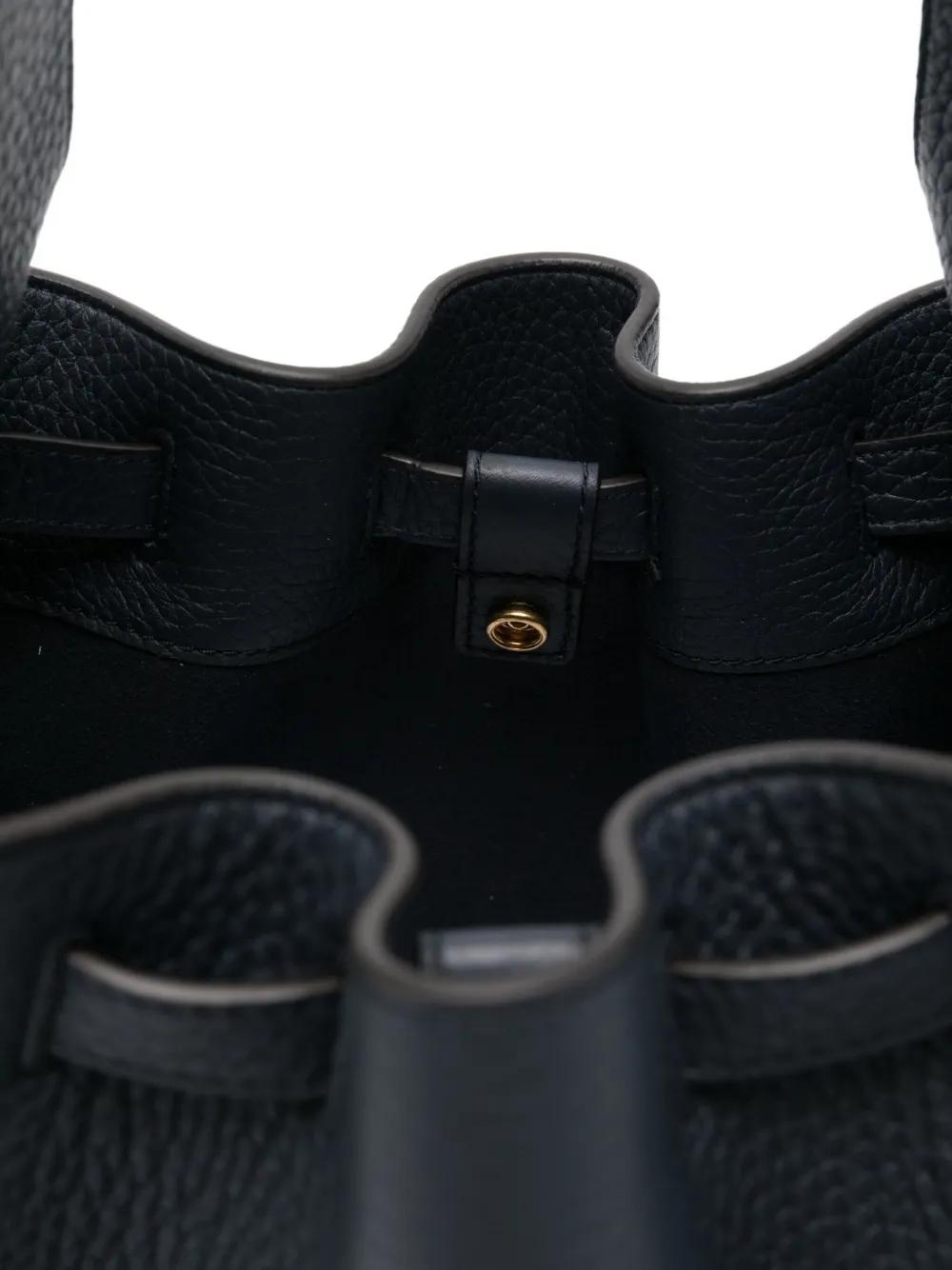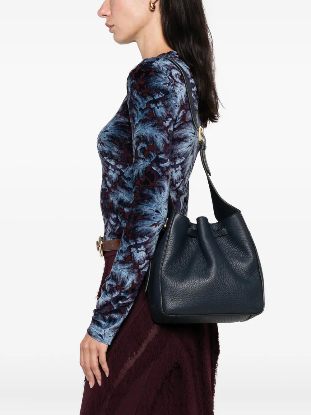 dark blue calf leather drawstring closure single top handle detachable pouch gold-tone hardware