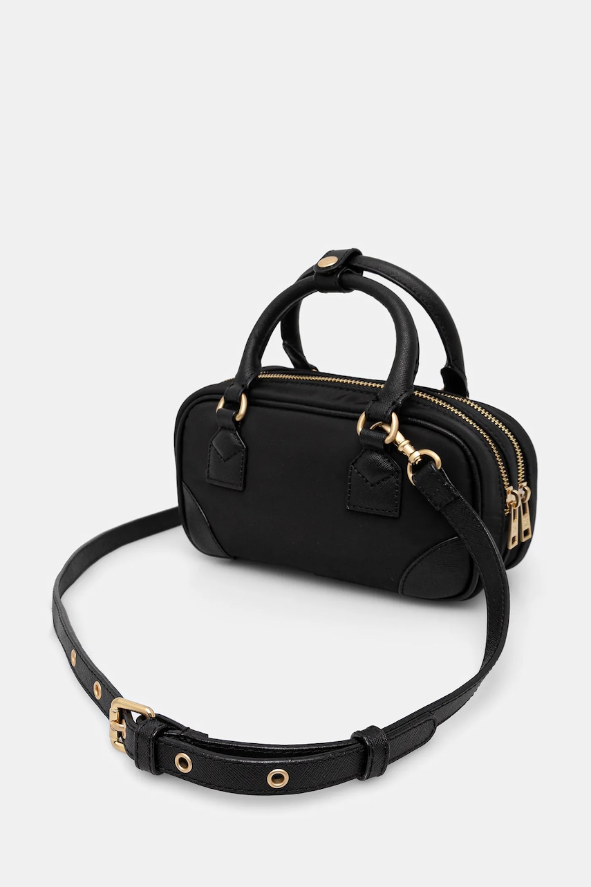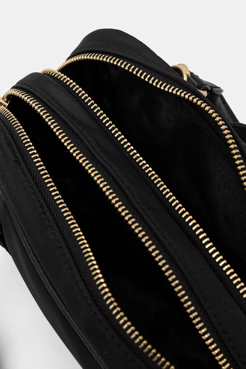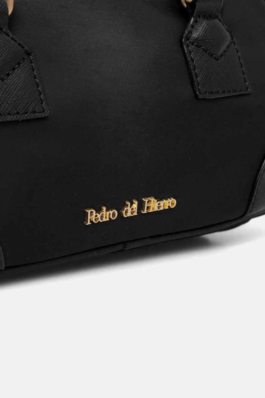 - Dwukomorowy model. - Wsuwana kieszeń wewnętrzna. - Posiada uchwyty i odpinany pasek z regulacją. - Długość uchwytów: 26 cm. - Długość minimalna paska: 106 cm. - Długość maksymalna paska: 120 cm. - Głębokość: 7 cm. - Wysokość: 10 cm. - Szerokość u podstawy: 20 cm.