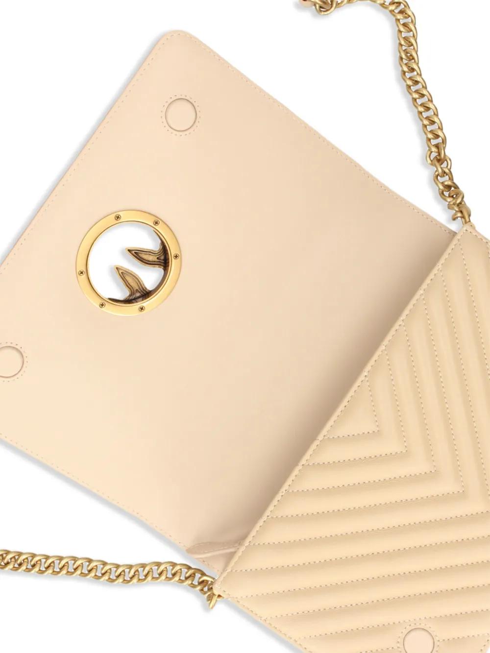 light beige calf leather chevron quilting adjustable leather and chain-link shoulder strap foldover top with magnetic fastening signature Love Birds buckle partitioned compartment internal zip-fastening pocket internal slip pocket gold-tone hardware