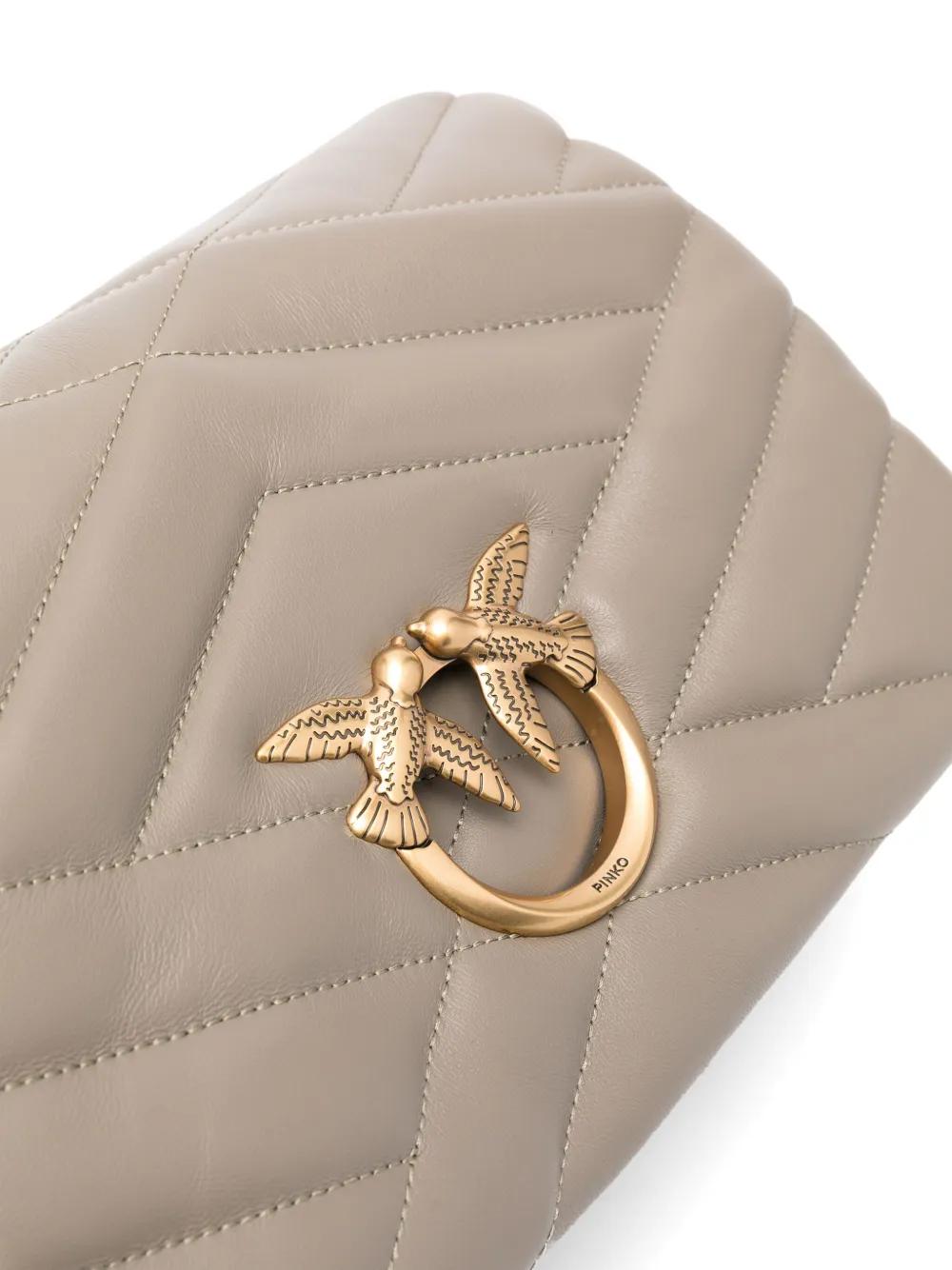 taupe grey calf leather padded design quilted signature Love Birds buckle to the front foldover top with magnetic fastening adjustable leather and chain-link shoulder strap partitioned compartment zip-fastening compartment internal slip pocket debossed internal logo microfibre lining gold-tone hardware This piece comes complete with a protective dust bag.