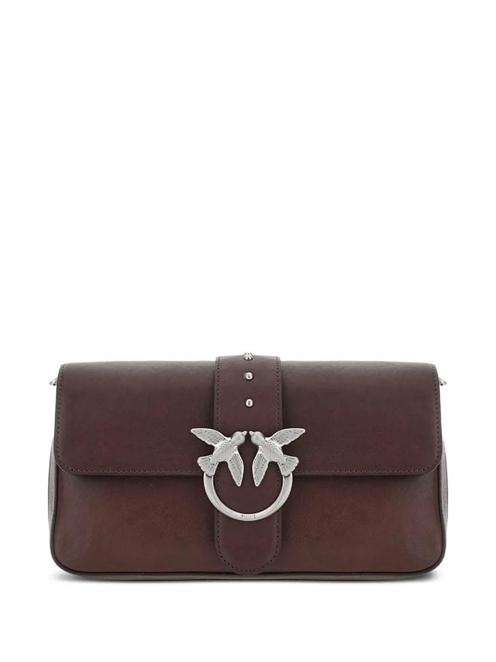 brown front flap closure signature Love Birds buckle adjustable shoulder strap