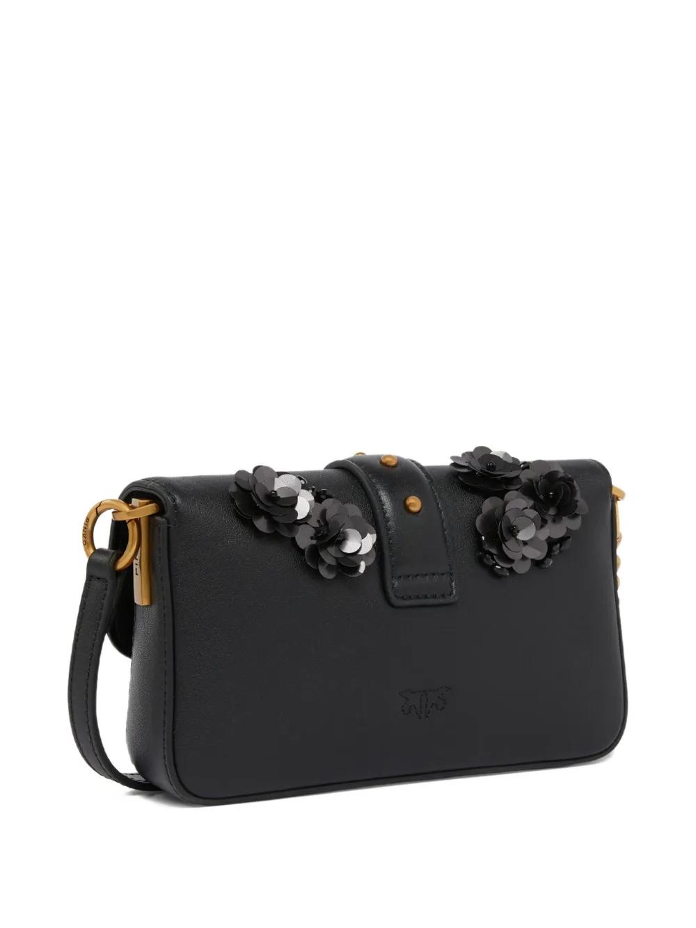 black signature Love Birds buckle leather flower embellishments gold-tone hardware chain-link strap