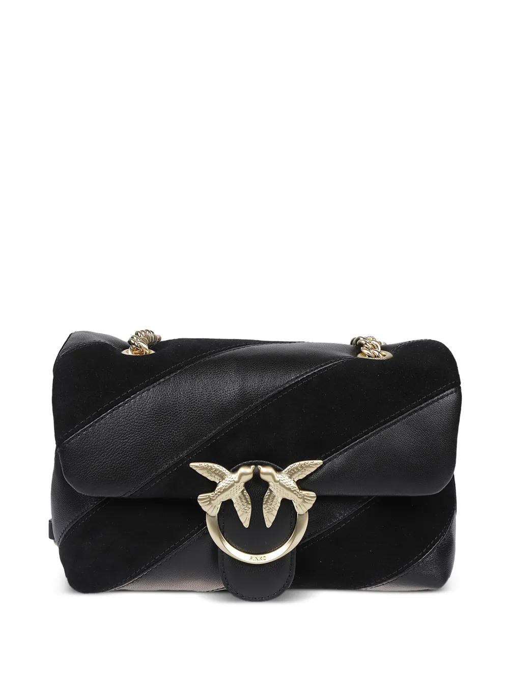 black quilted leather suede panels gold-tone Love Birds logo chain strap flap closure