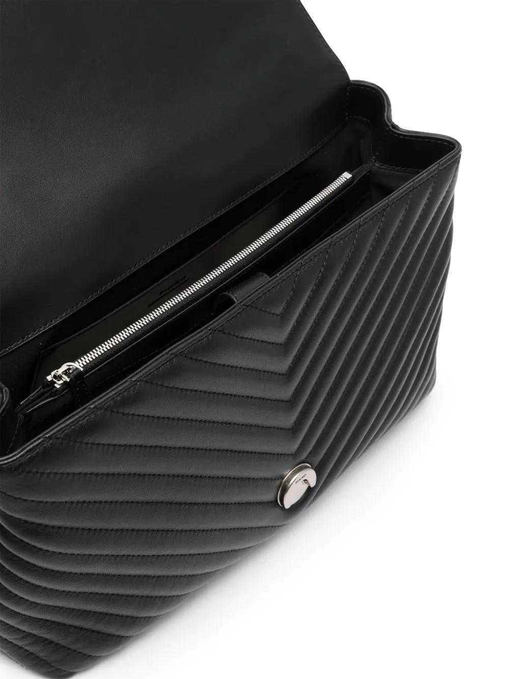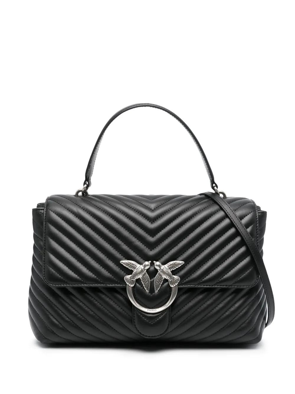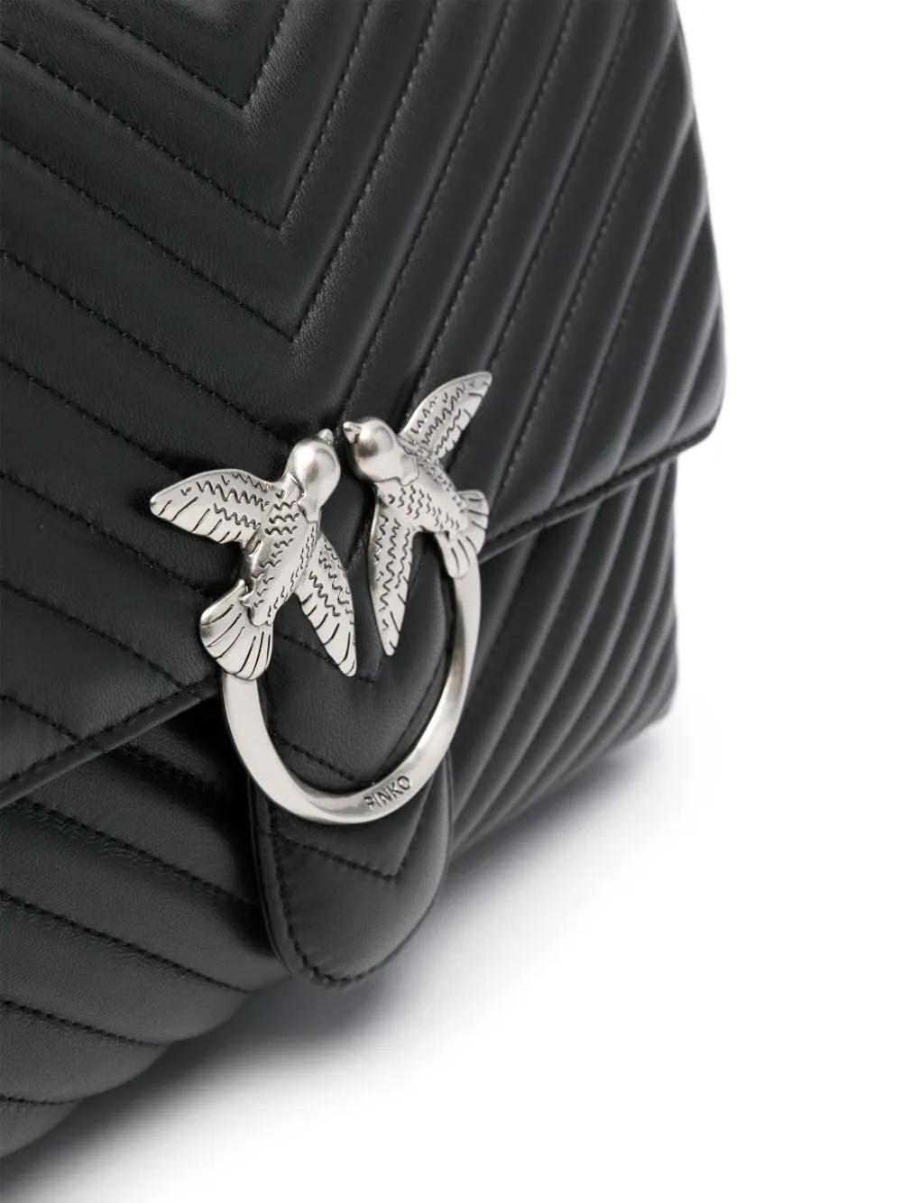 black calf leather grained texture chevron quilting signature Love Birds buckle foldover top single flat top handle detachable leather and chain-link shoulder strap partitioned compartment internal zip-fastening pocket debossed internal logo full lining logo-engraved silver-tone hardware concealed clasp fastening