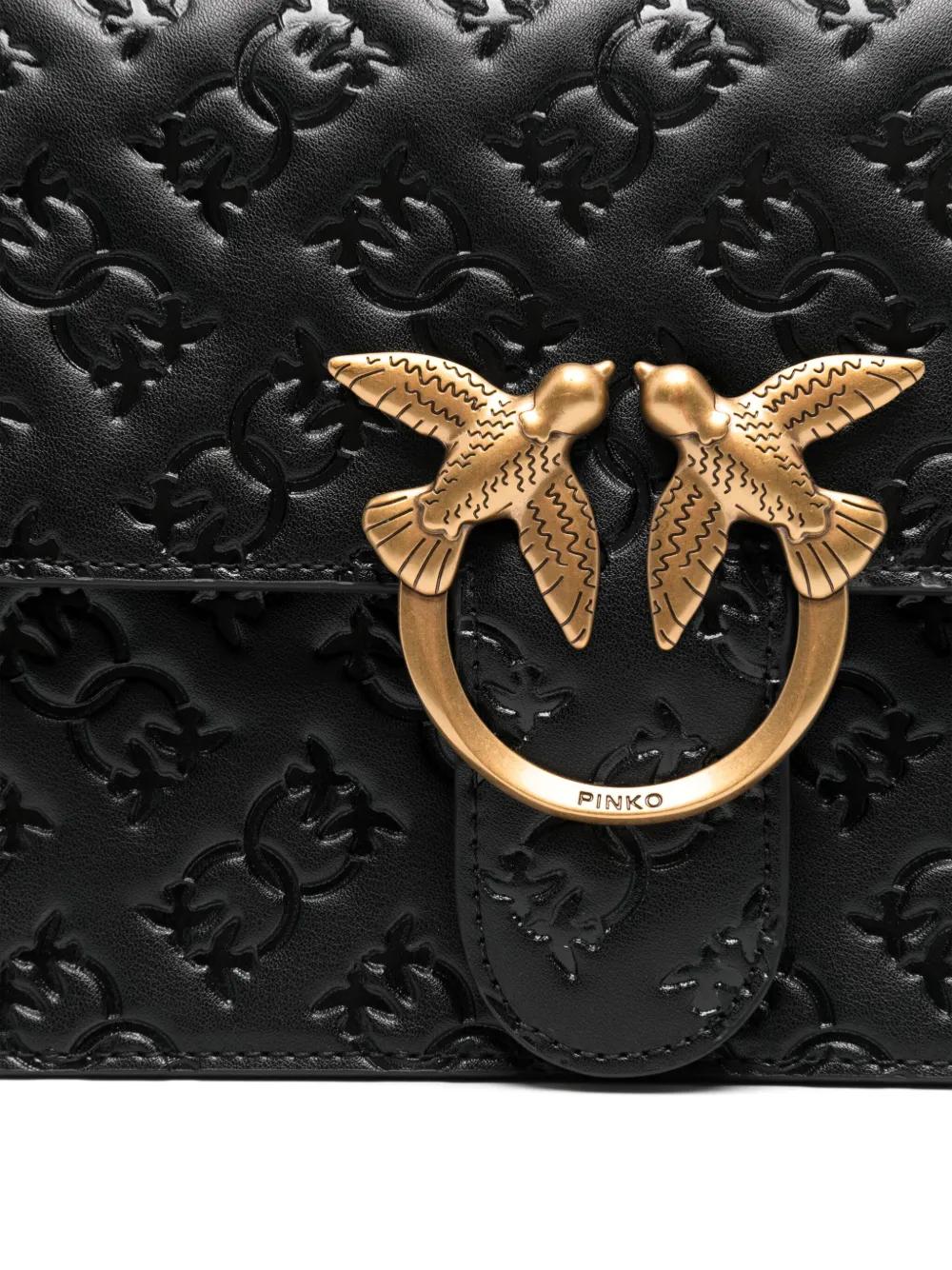 black calf leather smooth grain all-over debossed logo Love Birds signature Love Birds buckle foldover top with magnetic fastening sliding chain-link shoulder strap partitioned compartment internal zip-fastening pocket full lining This piece comes complete with a protective dust bag.