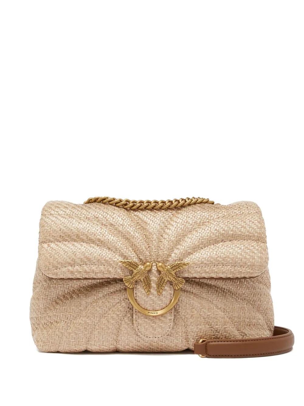 sand beige foldover top with magnetic fastening leather and chain-link shoulder strap signature Love Birds buckle This piece comes complete with a protective dust bag.