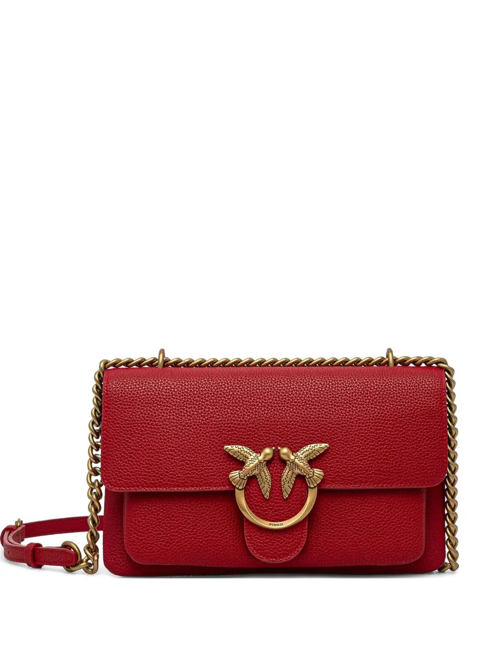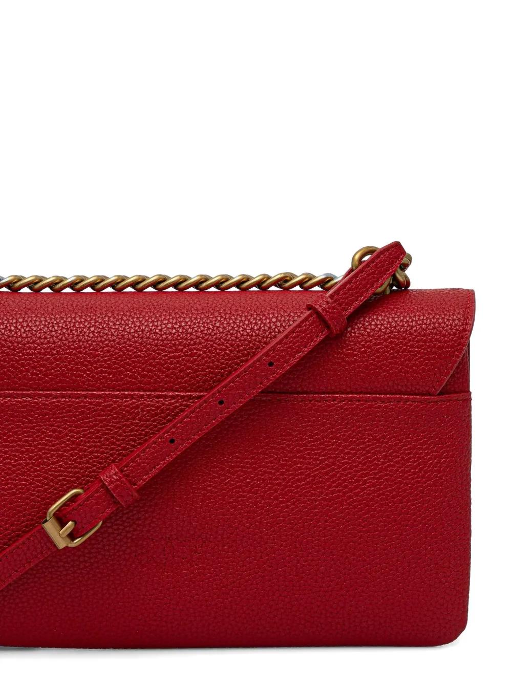 cardinal red foldover top with magnetic fastening adjustable leather and chain-link shoulder strap partitioned compartment internal zip-fastening pocket