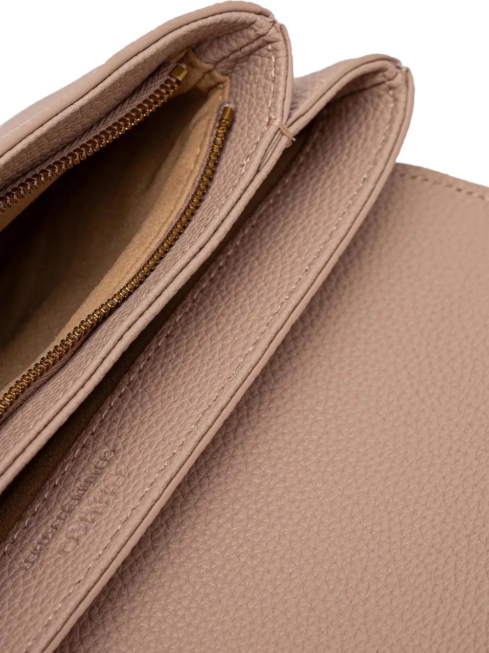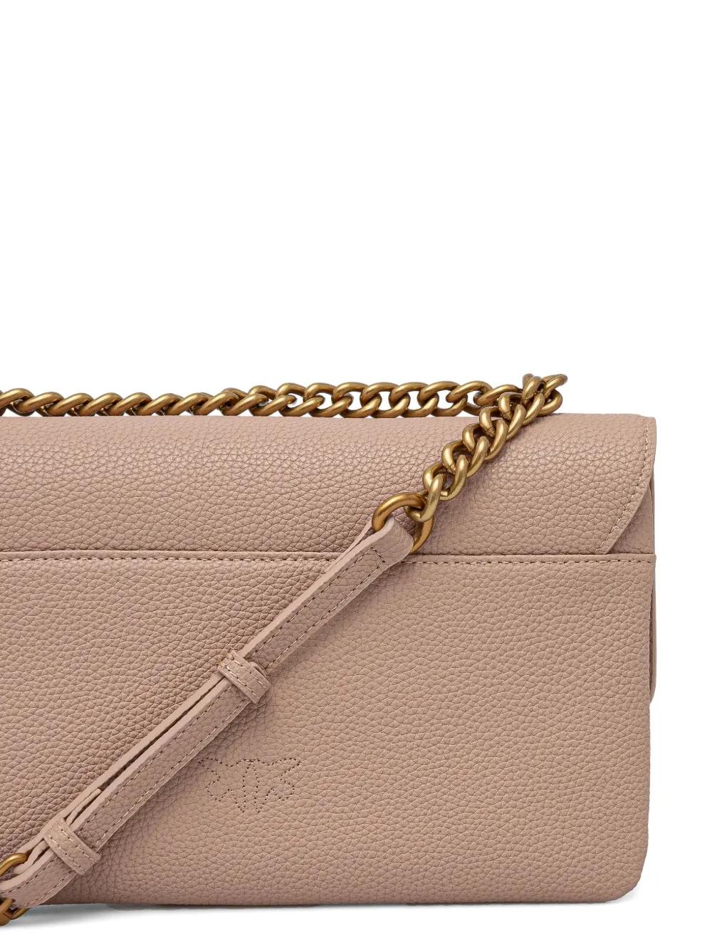 powder pink foldover top with magnetic fastening adjustable leather and chain-link shoulder strap partitioned compartment internal zip-fastening pocket