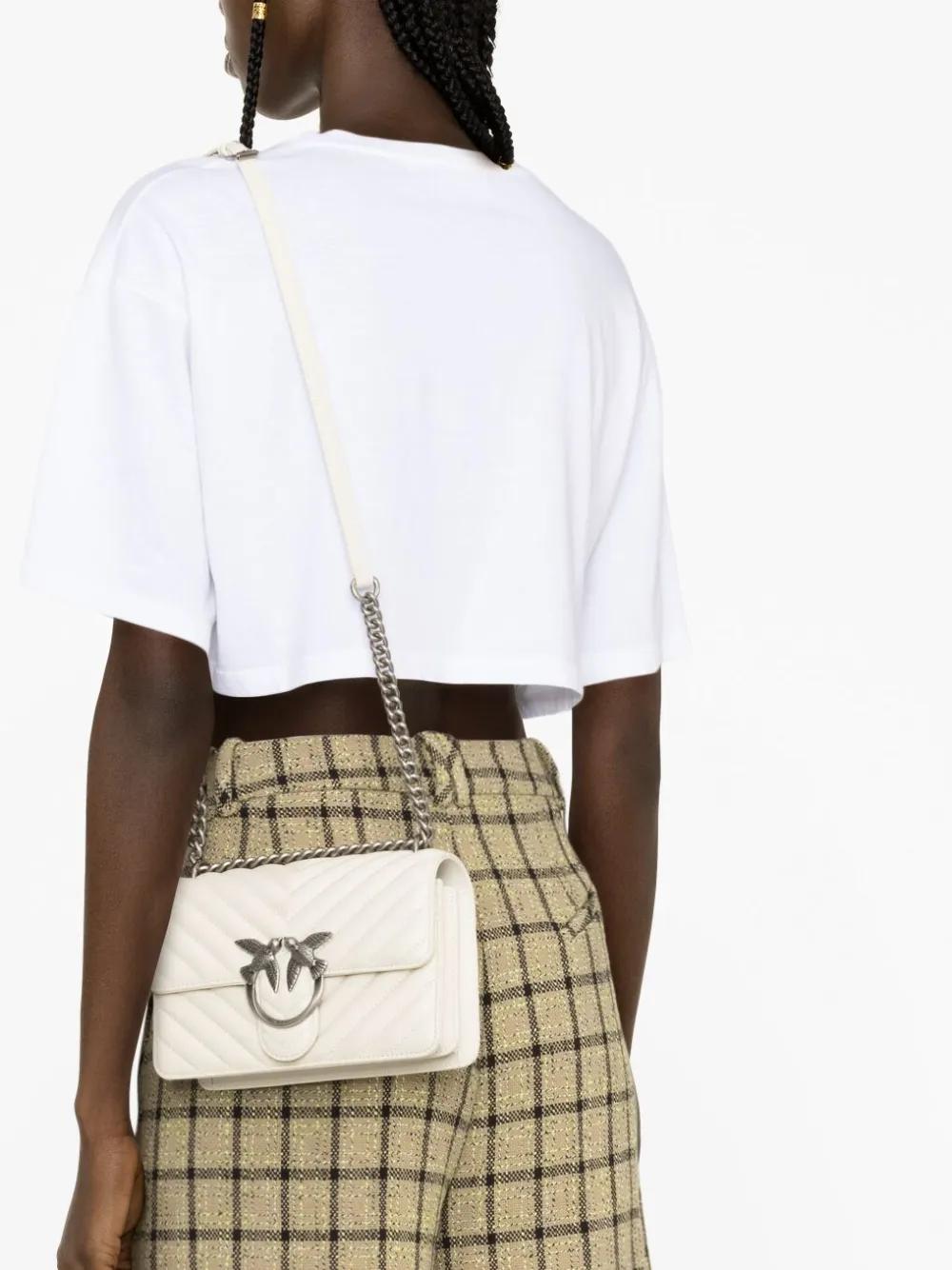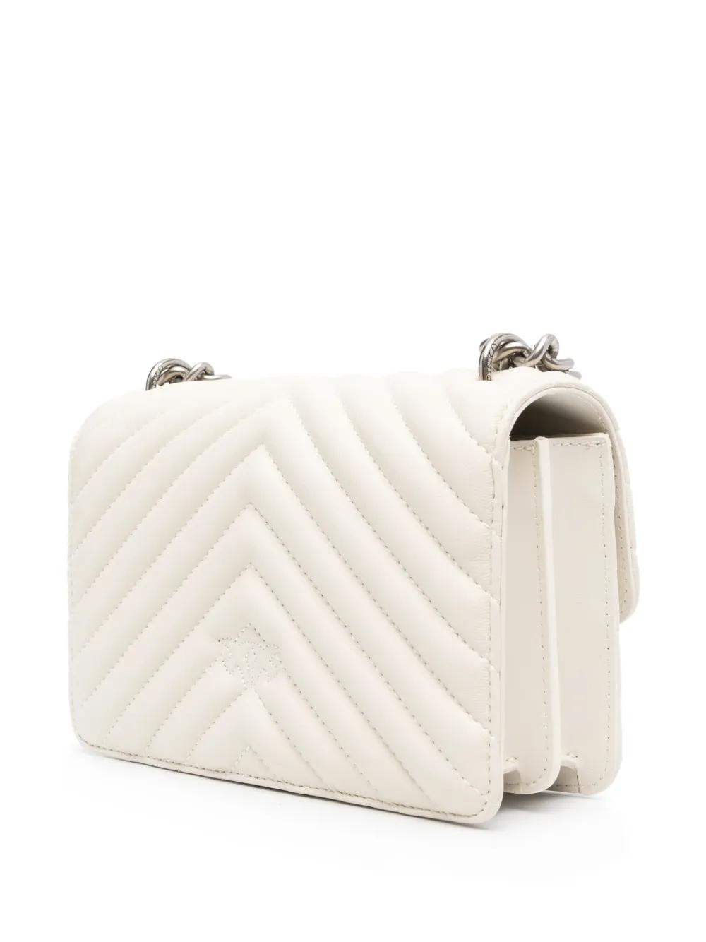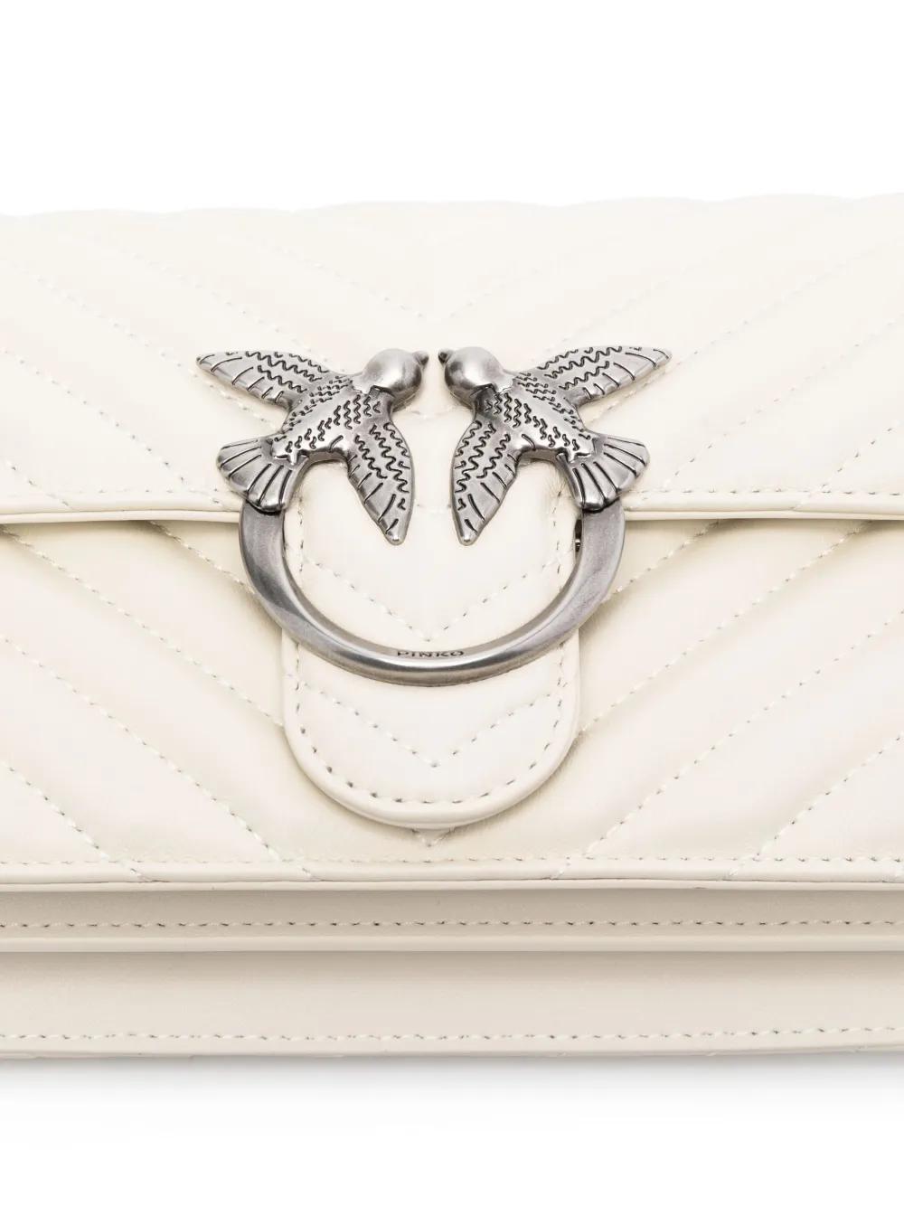white lambskin quilted signature Love Birds buckle adjustable leather and chain-link shoulder strap foldover top concealed magnetic fastening partitioned compartment internal zip-fastening pocket internal slip pocket