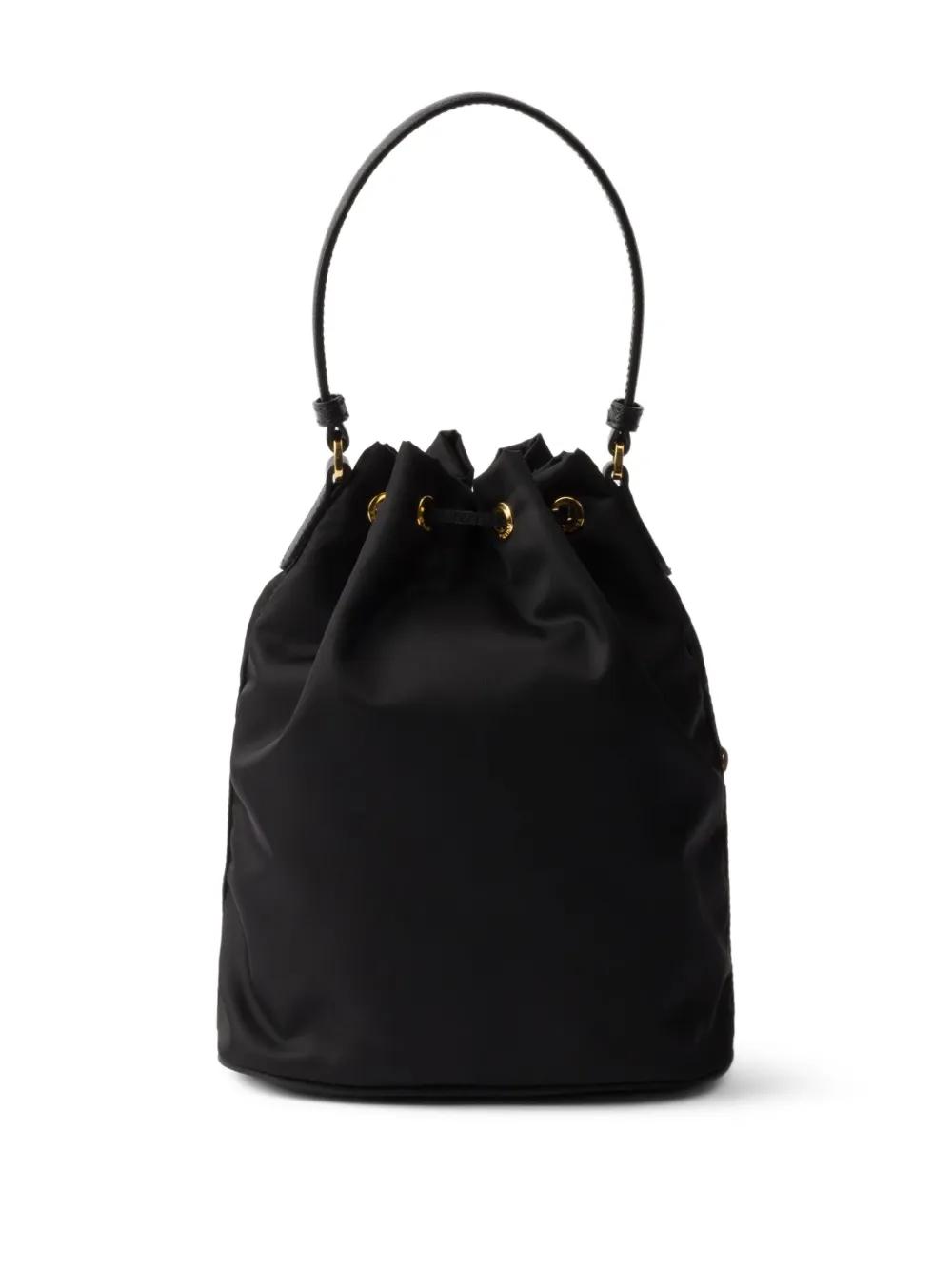 black gold-tone hardware drawstring closure front zip pocket structured top handle internal logo plaque