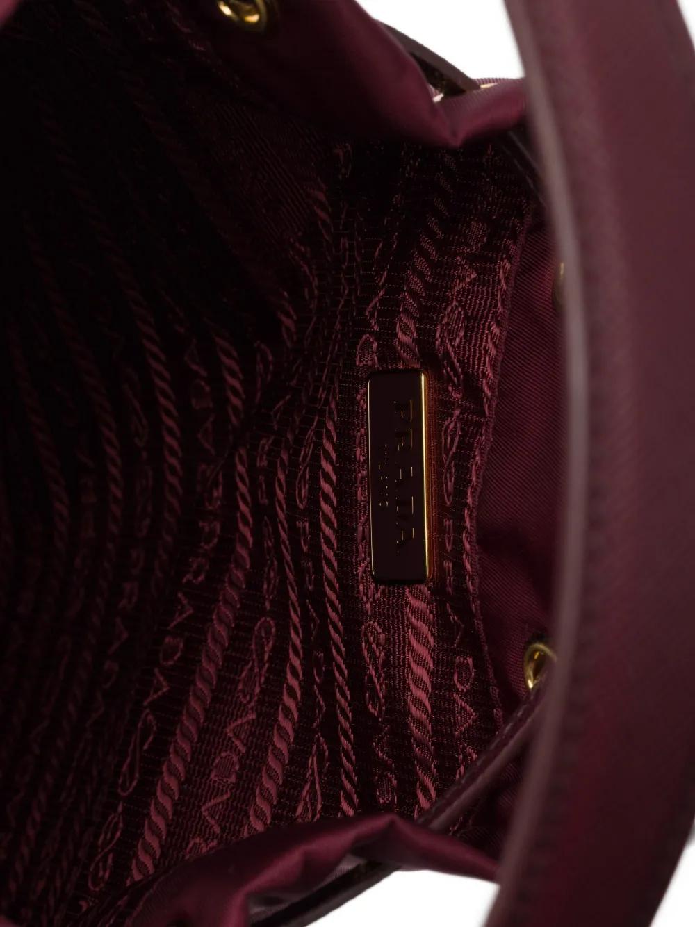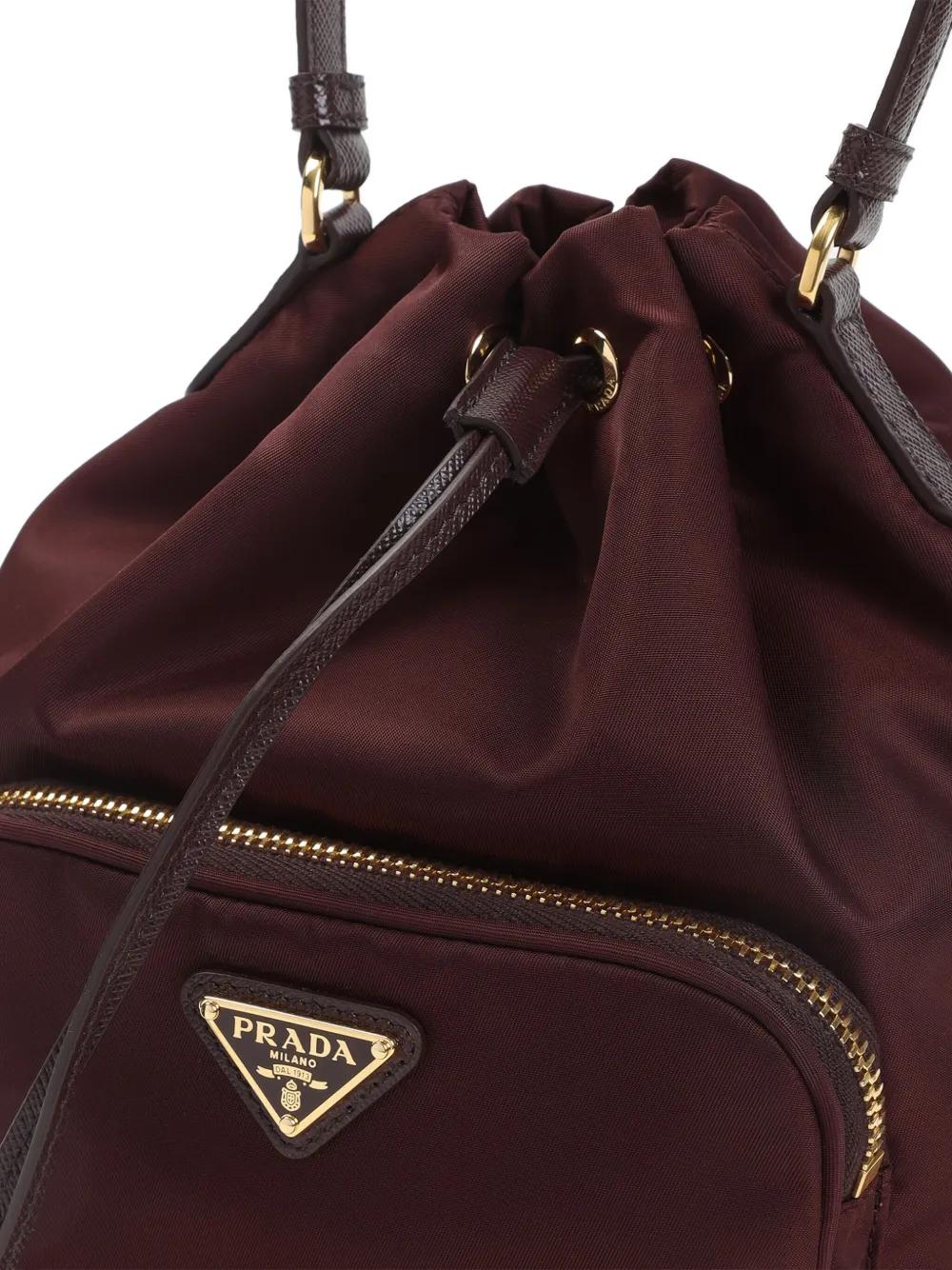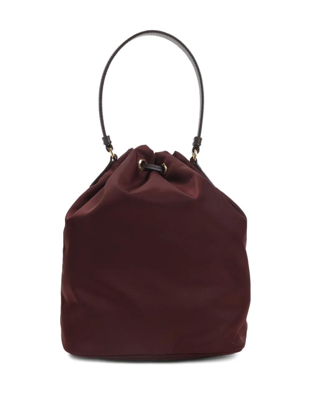 burgundy drawstring closure leather handle detachable shoulder strap zip pocket enamel triangle logo