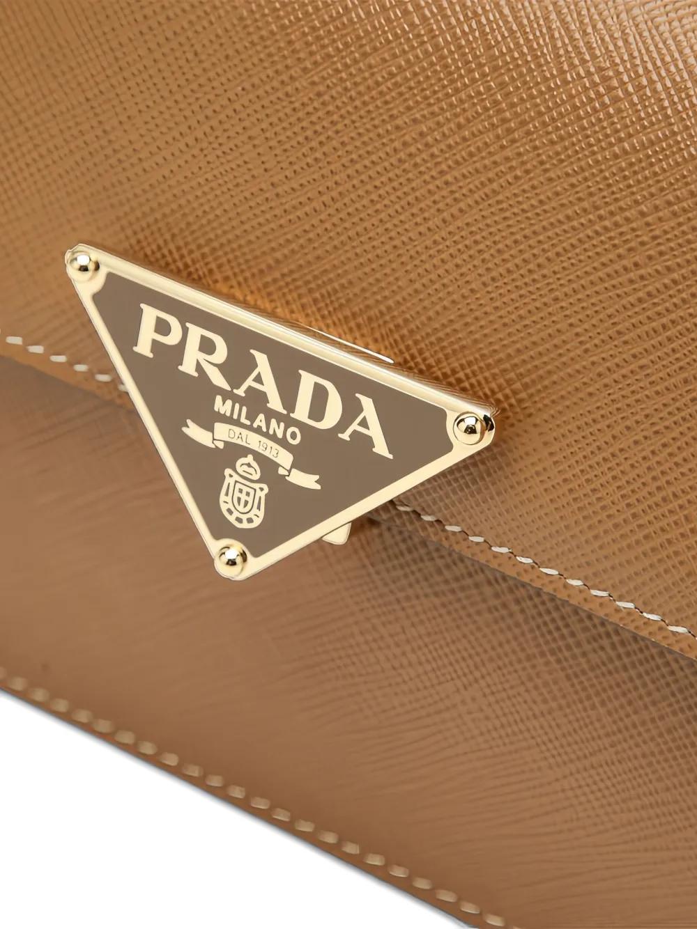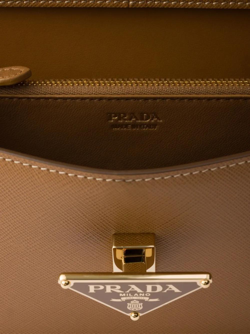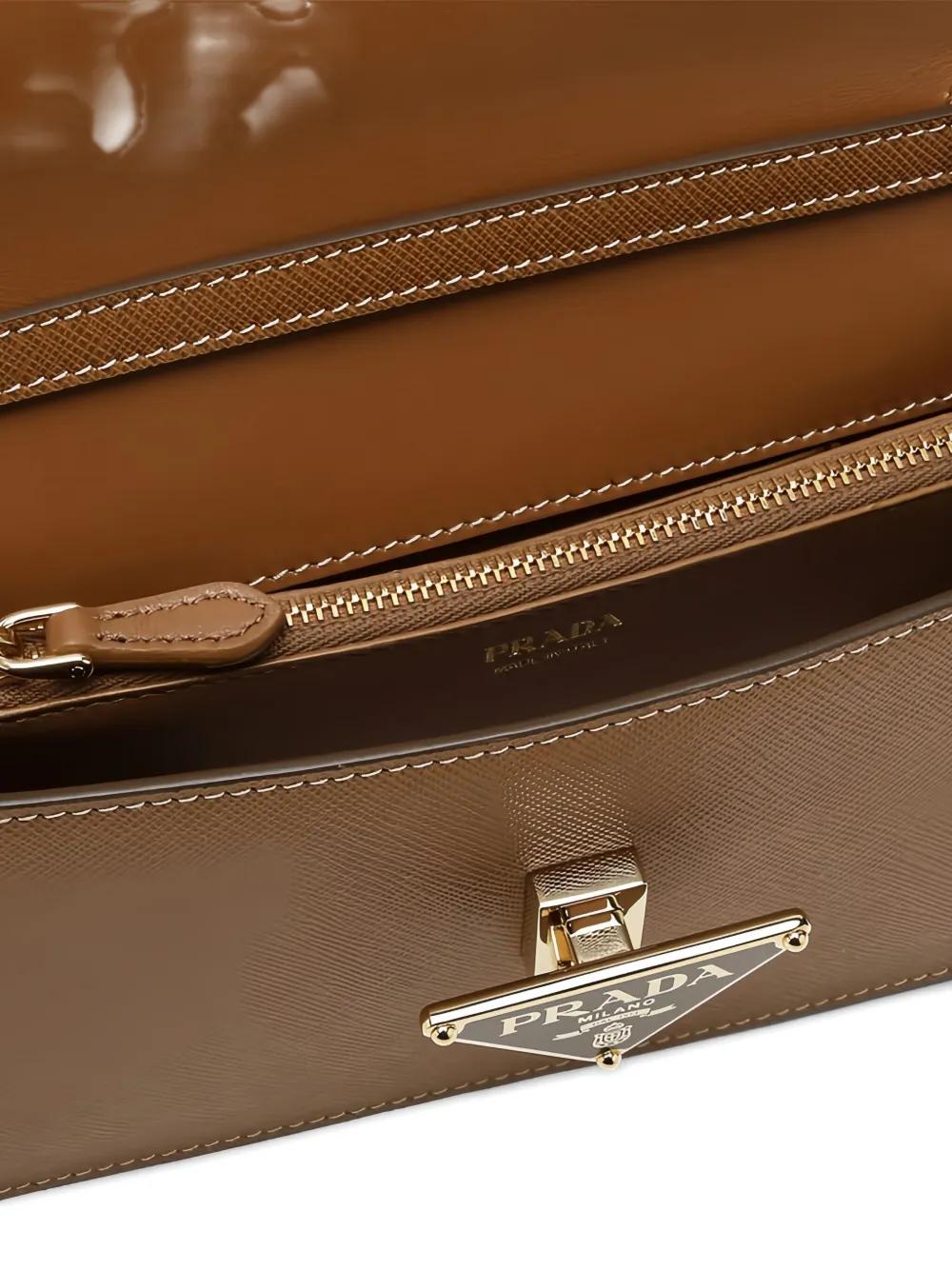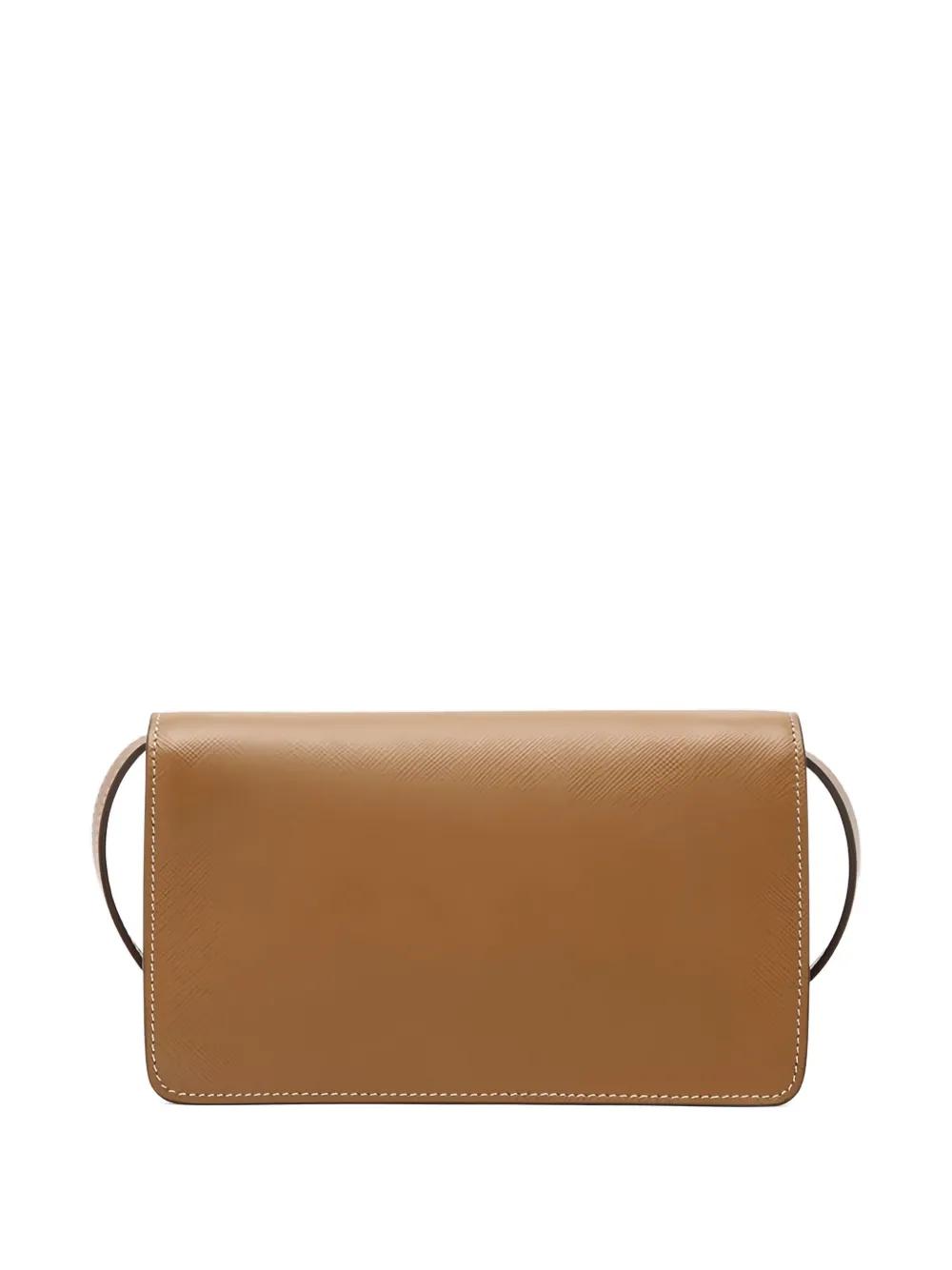 brown Saffiano leather adjustable shoulder strap push-lock clasp logo-engraved clasp central-zip pocket