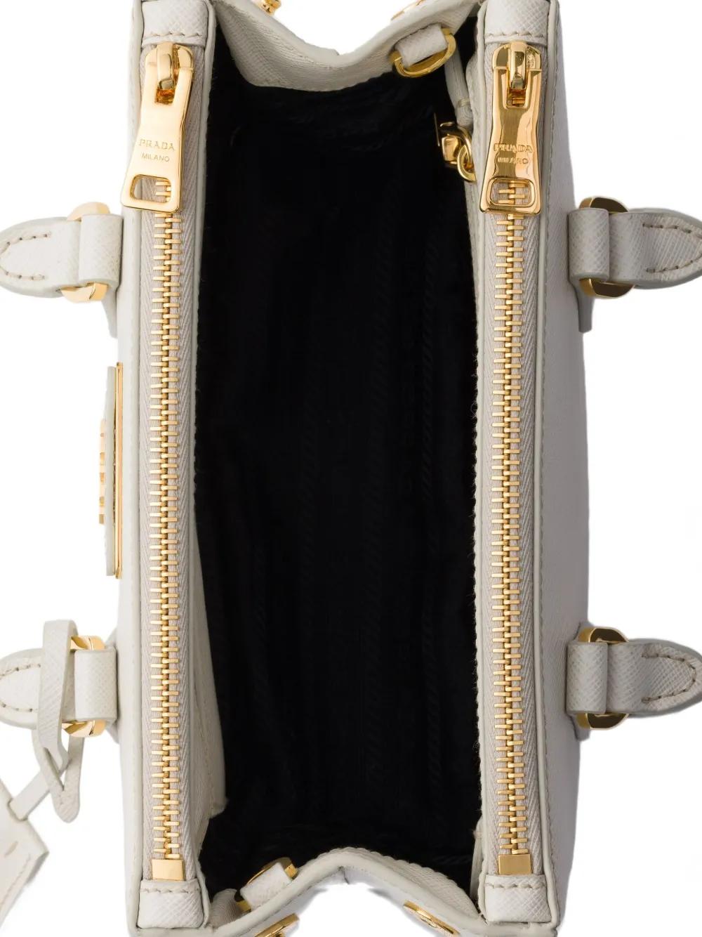 chalk white saffiano leather top handle detachable shoulder strap zip fastening metal hardware triangle logo