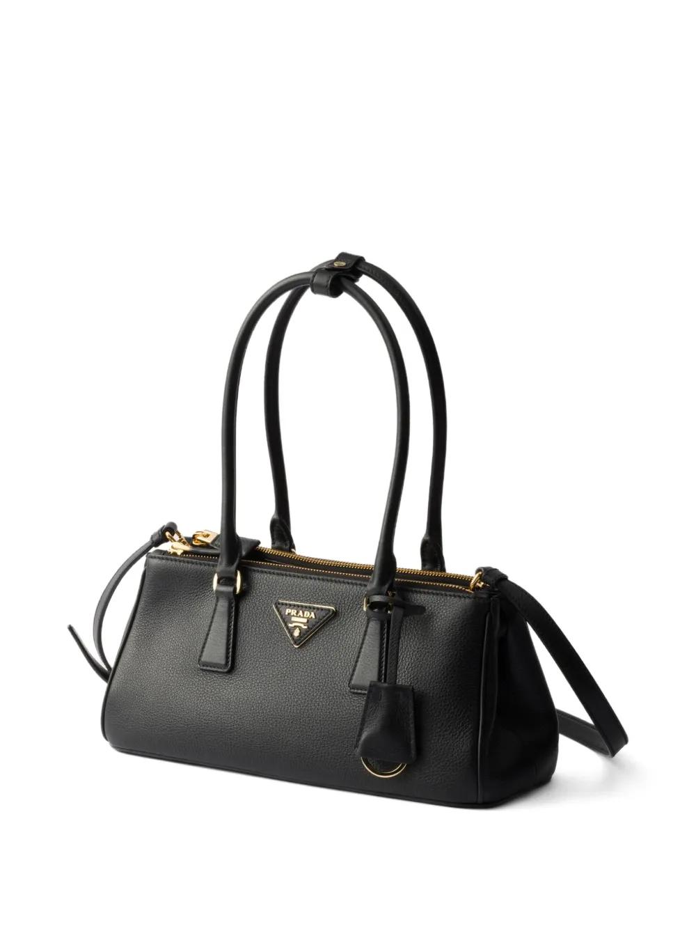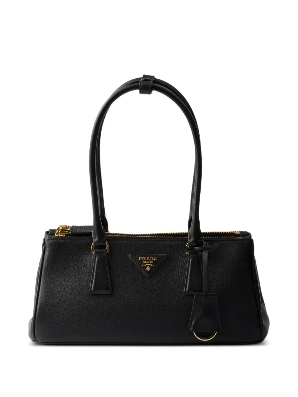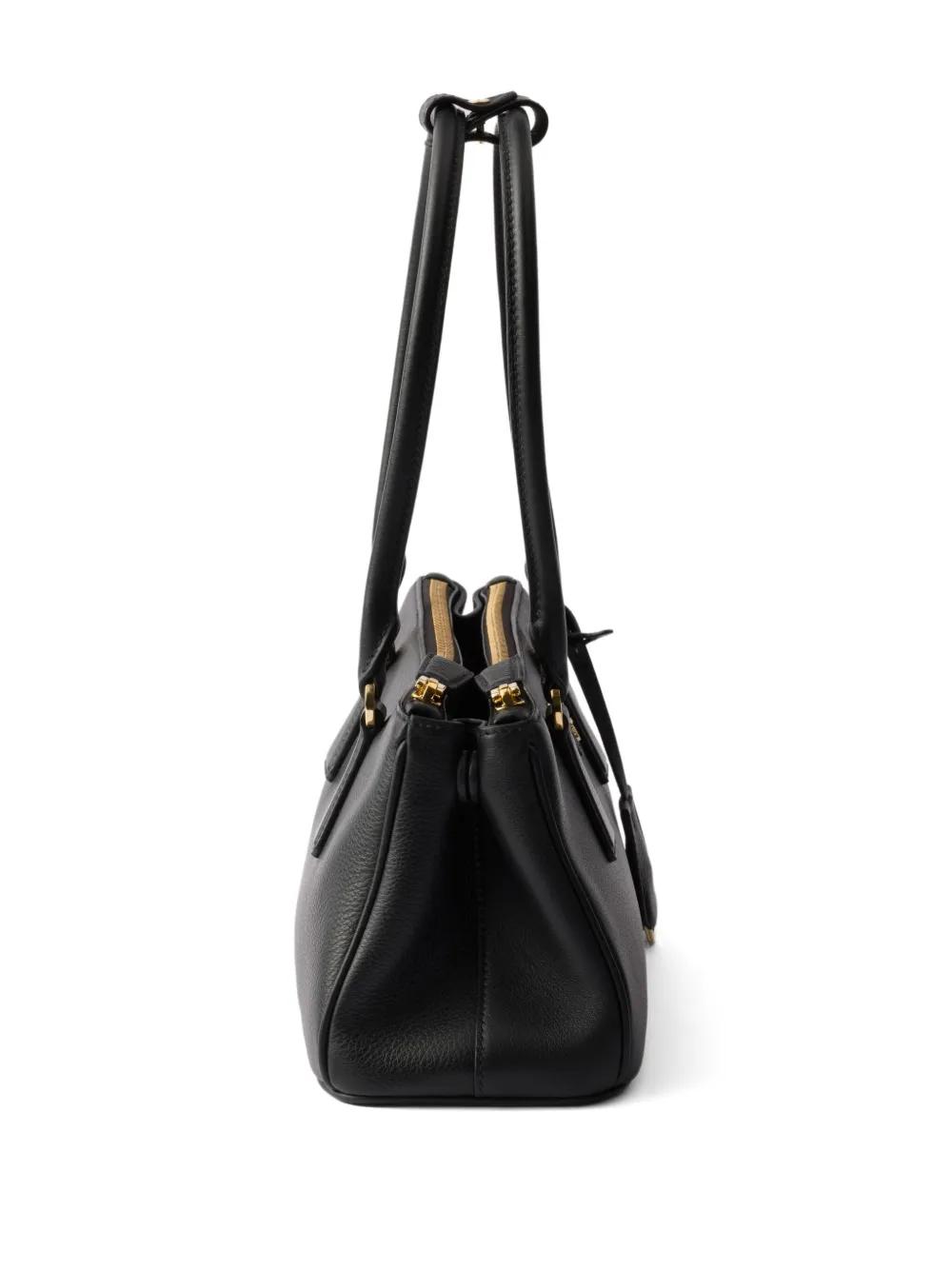 black gold-tone hardware triangle logo plaque dual top handles zip closure detachable keyring charm
