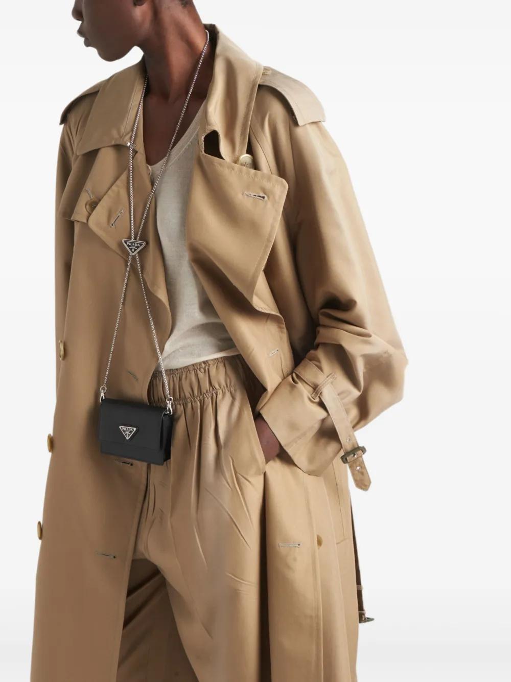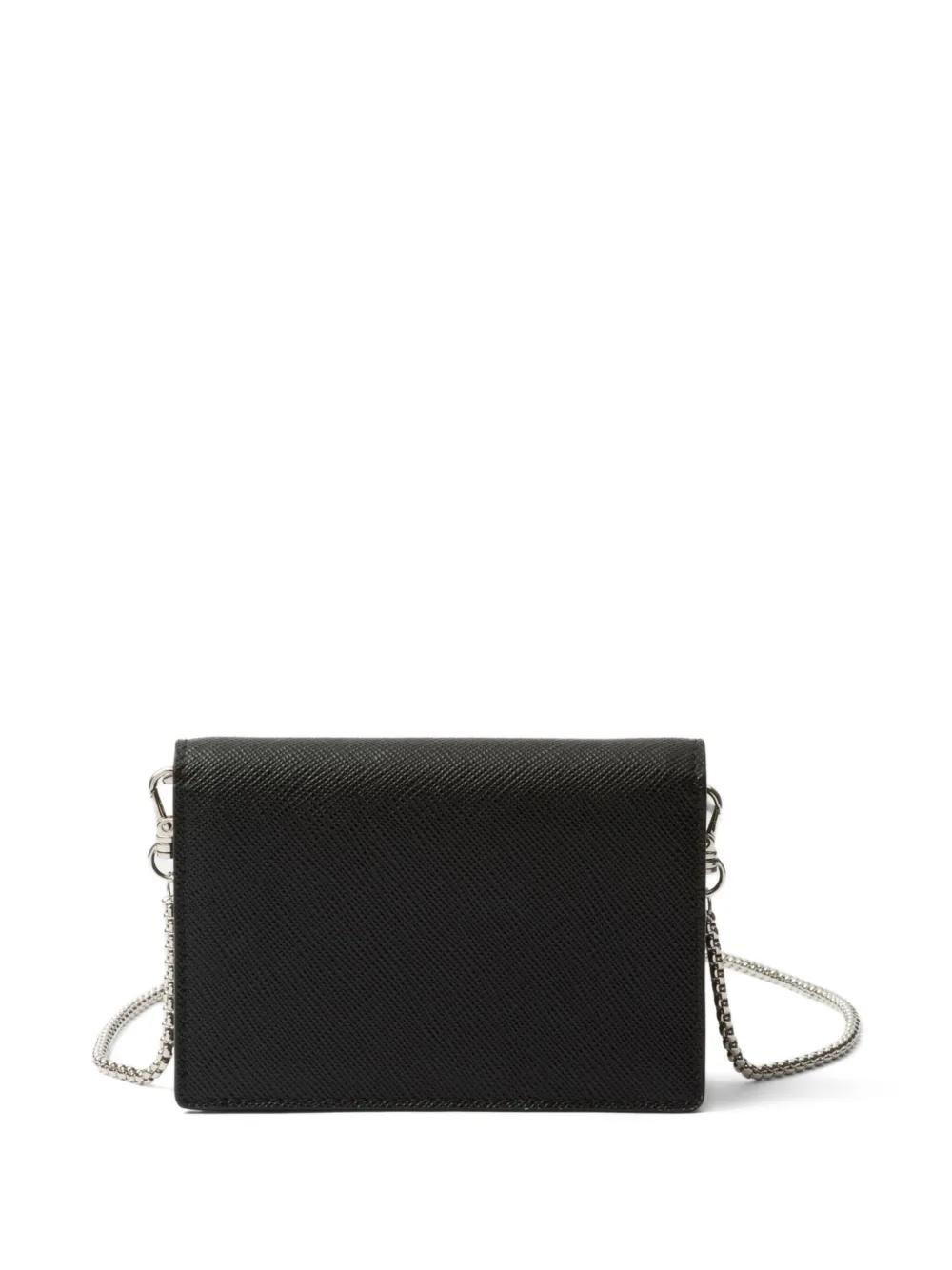 black foldover top with press-stud fastening detachable chain-link shoulder strap enamel triangle logo This piece comes complete with a protective dust bag.