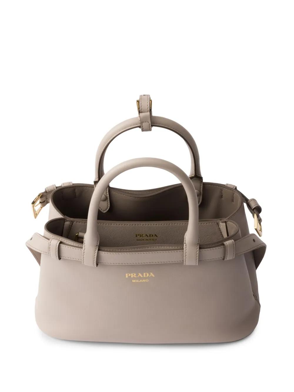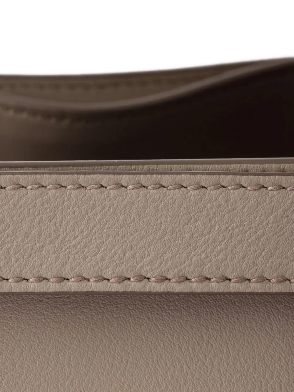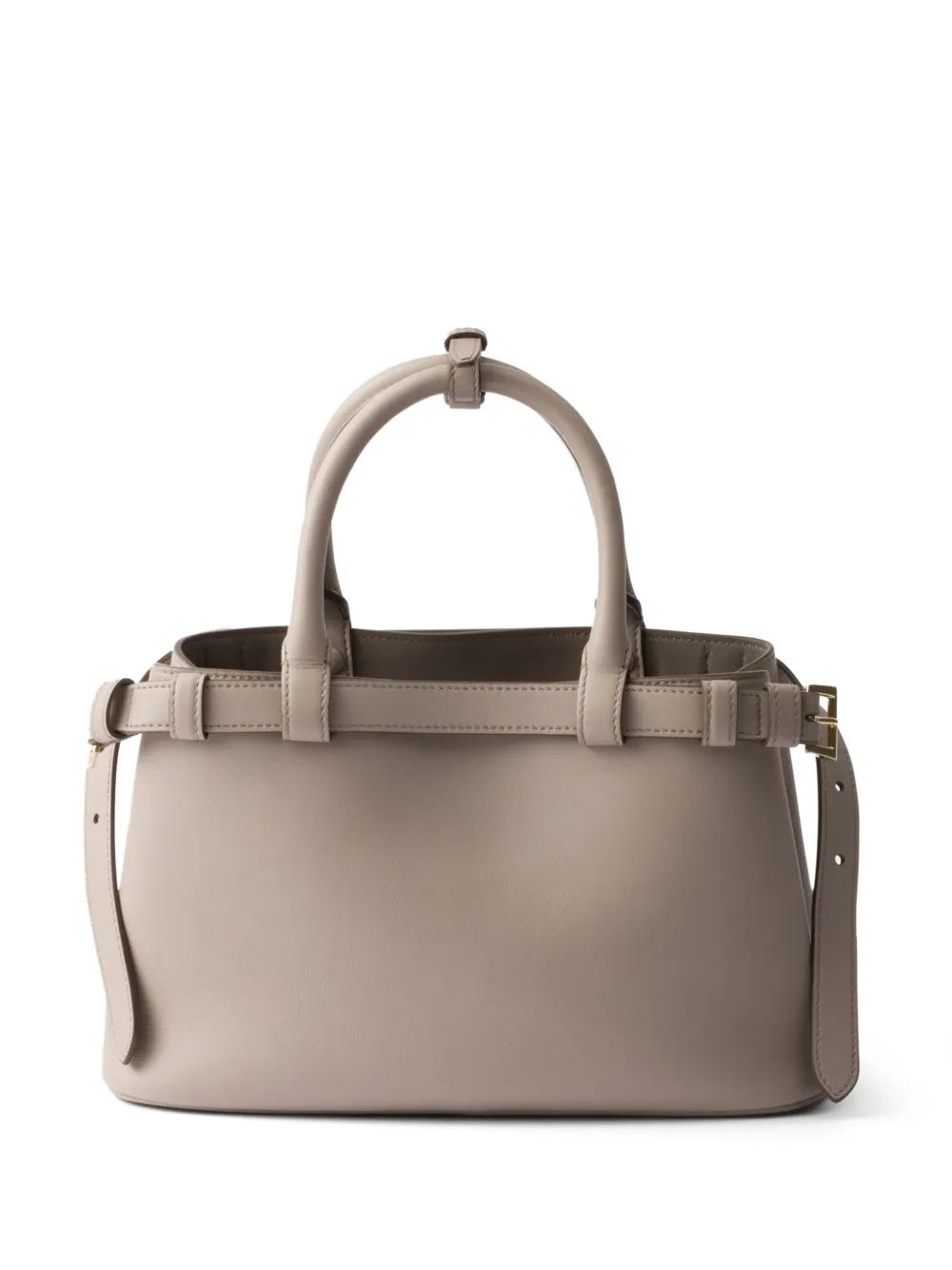 grey leather smoothing finish belted silhouette logo stamp to the front two rolled top handles adjustable handle wrap partitioned compartment multiple internal slip pockets full lining gold-tone hardware rectangle body