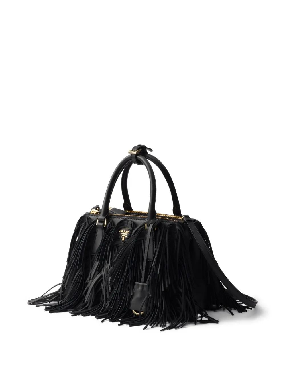 black enamel triangle logo feather-trim detailing adjustable detachable shoulder strap open top