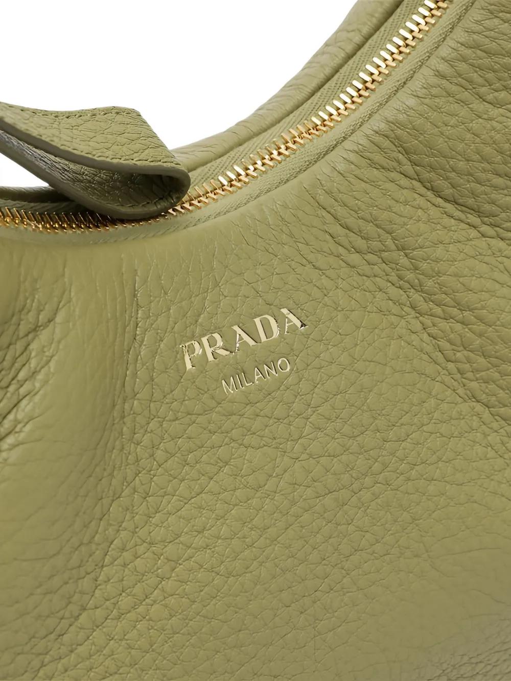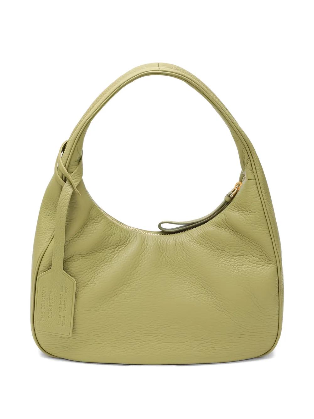 green pebbled leather top handle zip fastening curved silhouette logo embossed