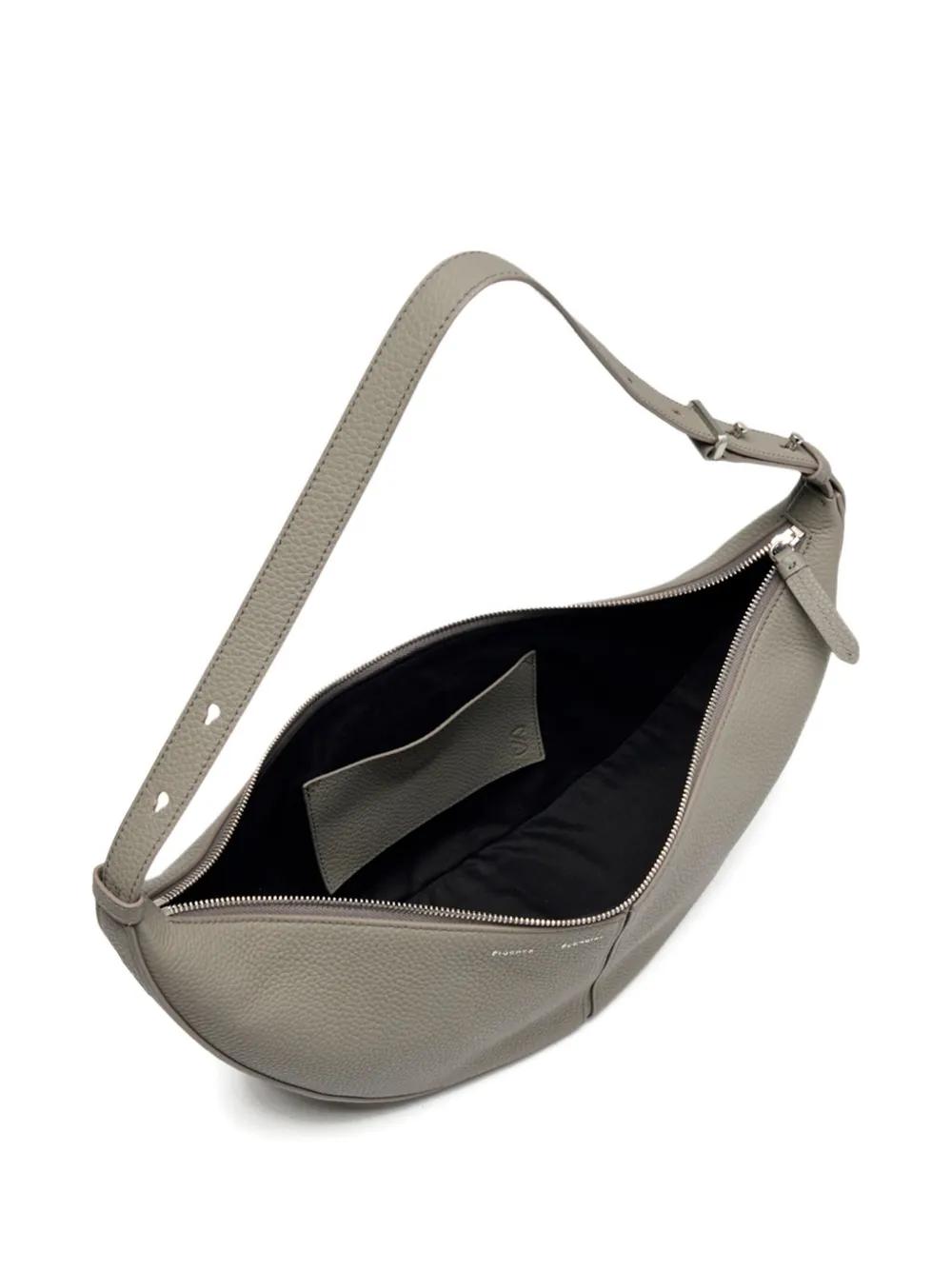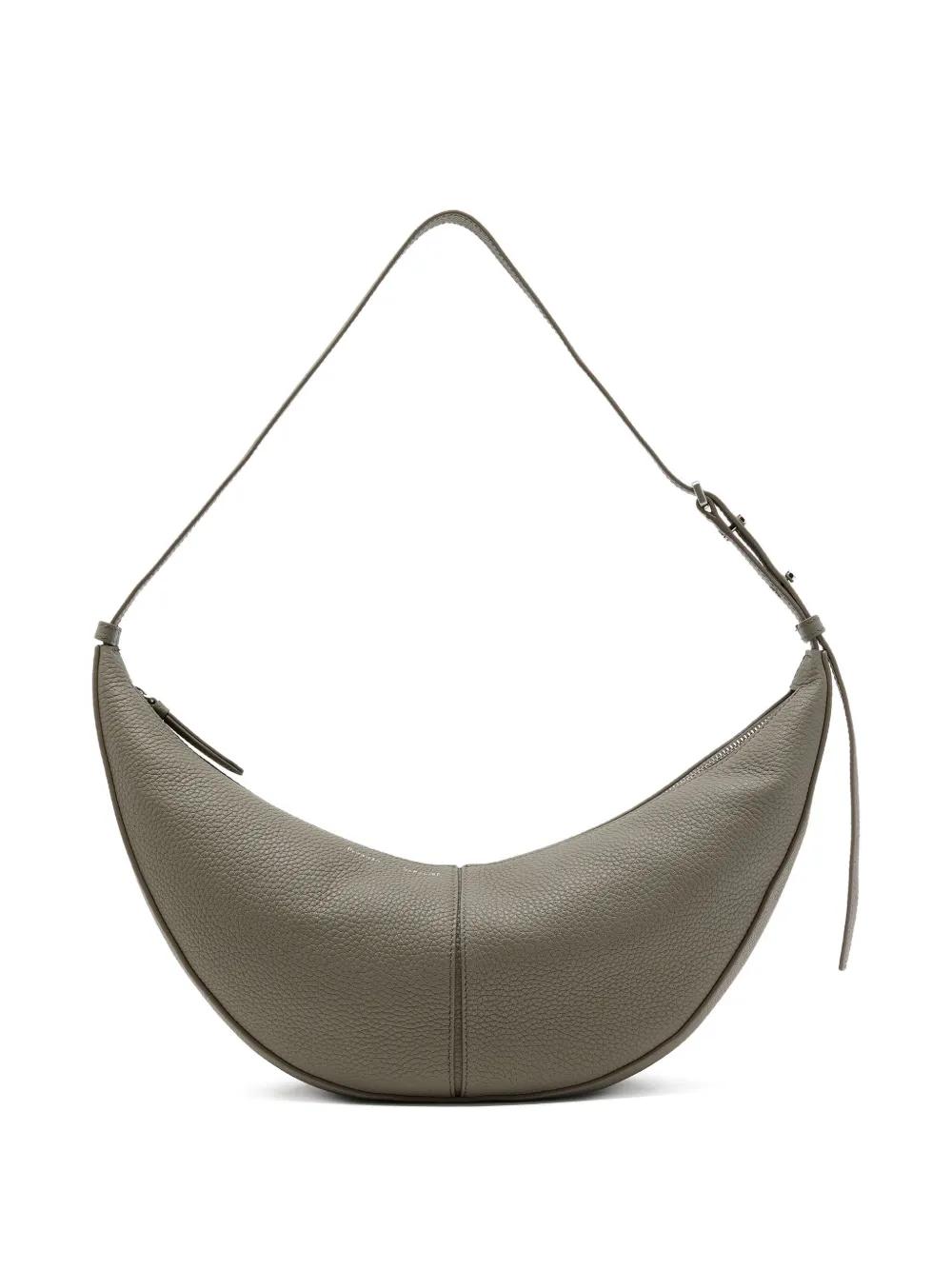 slate grey pebbled leather curved shape adjustable strap buckle fastening zip closure