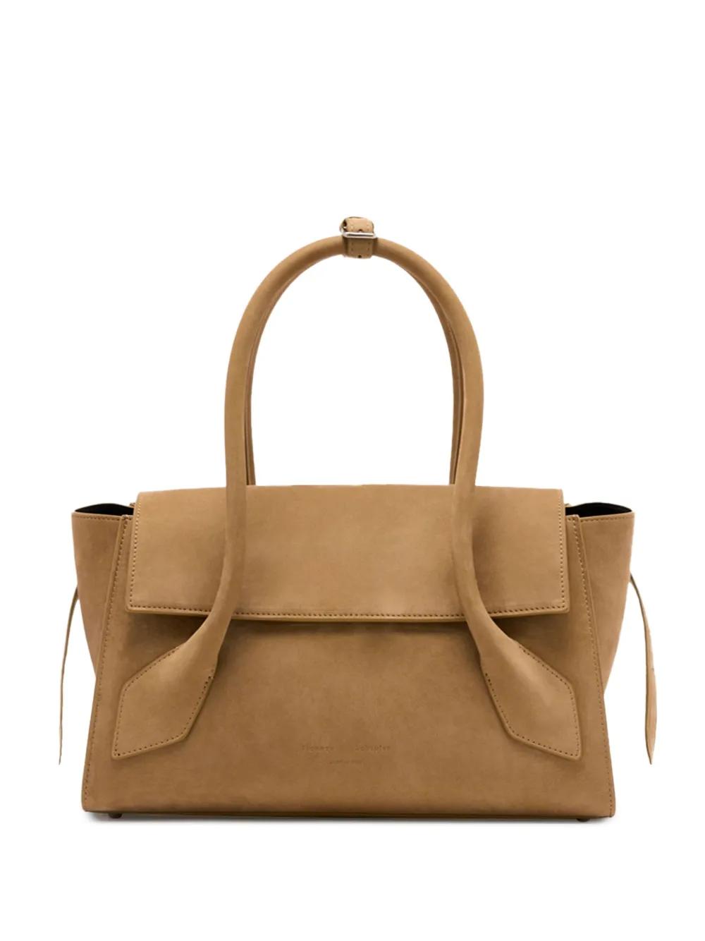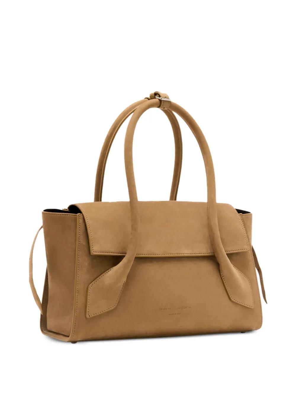 sand brown foldover top with magnetic fastening two rolled top handles internal zip-fastening pocket This piece comes complete with a protective dust bag.