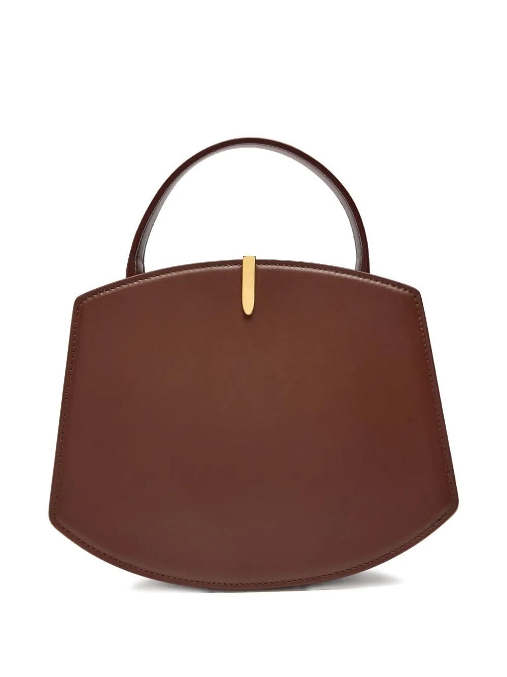 brown top handle gold-tone hardware top clasp fastening internal slip pocket structured shape