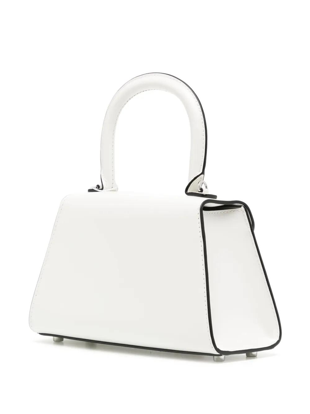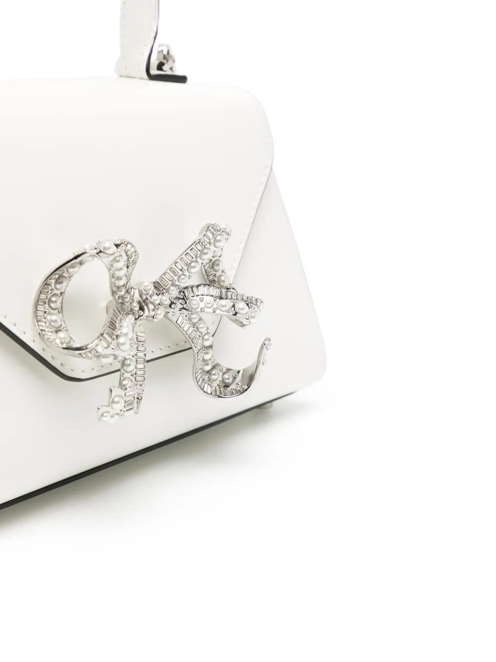 white leather crystal embellishment bow detailing foldover top single circular top handle detachable shoulder strap main compartment
