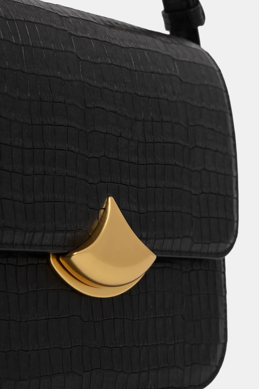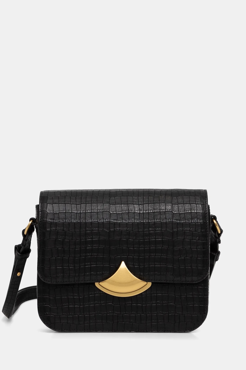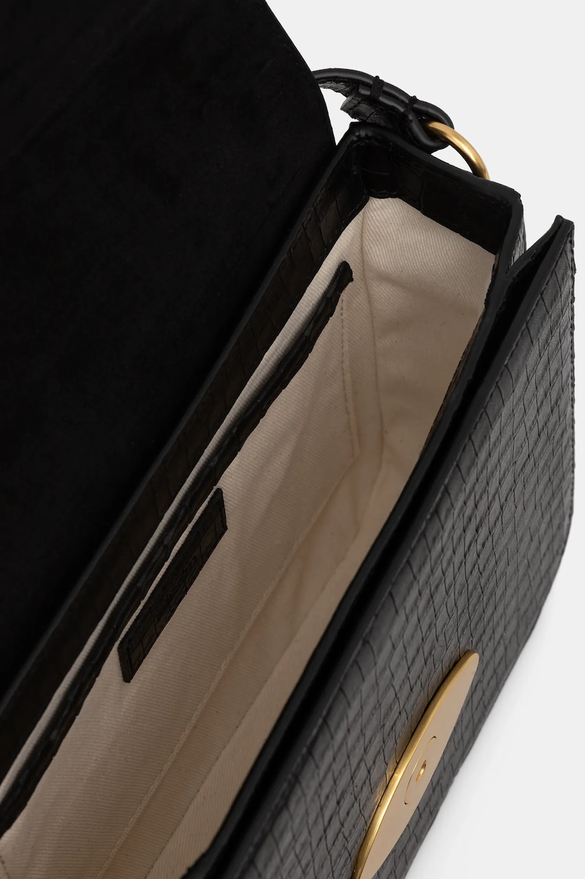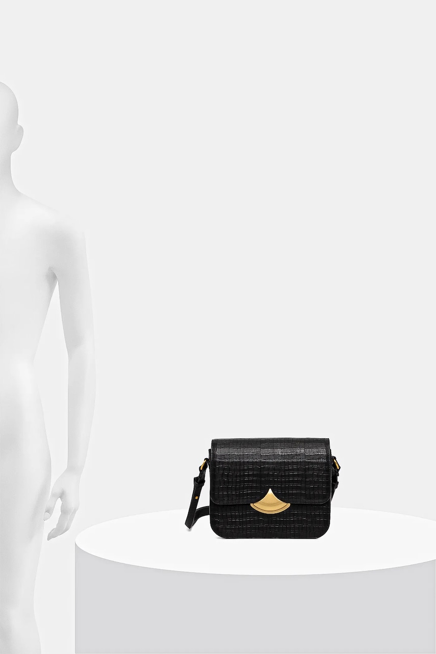 - Klapa zapinana na magnes. - Posiada dwie komory. - Wewnętrzna, wsuwana kieszeń na telefon. - Nieodpinany długi pasek bez regulacji. - Dołączony tekstylny worek zabezpiecza produkt przed kurzem. - Długość paska: 86 cm. - Głębokość: 6 cm. - Wysokość: 16 cm. - Szerokość u podstawy: 22 cm.