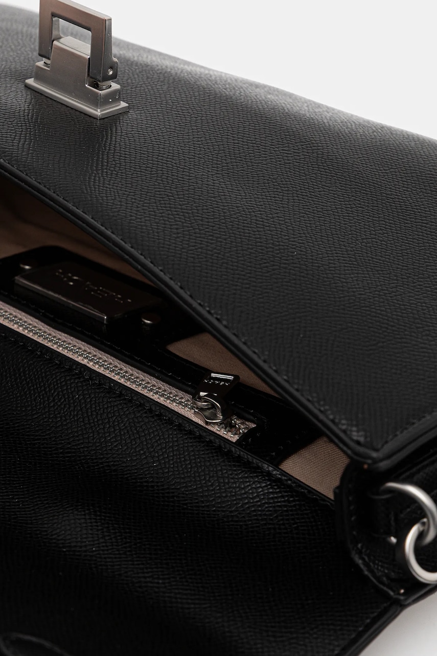 - Klapa zapinana na zatrzask. - Nie mieści formatu A4. - Trzy kieszonki wewnętrzne: jedna zapinana na suwak, dwie wsuwane. - Model z podszewką. - Posiada uchwyt i odpinany pasek z regulacją. - Dołączony tekstylny worek zabezpiecza produkt przed kurzem. - Długość minimalna paska: 113,5 cm. - Długość maksymalna paska: 128,5 cm. - Długość uchwytu: 20 cm. - Głębokość: 5 cm. - Wysokość: 16 cm. - Szerokość u podstawy: 33 cm.