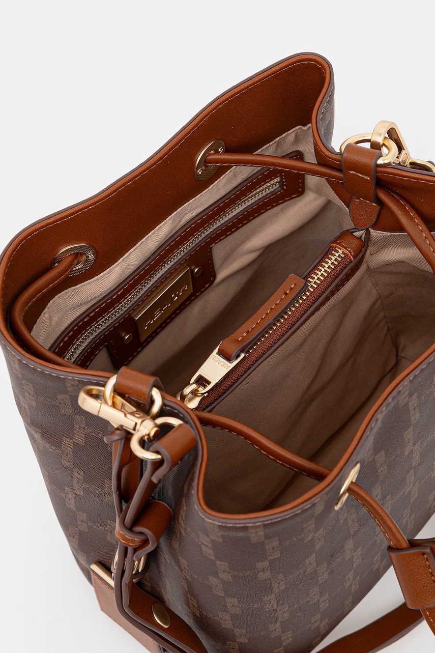 - Nie mieści formatu A4. - Komora ściągana troczkami. - Posiada dwie przegrody. - Dwie kieszonki wewnętrzne zapinane na suwak. - Wsuwane kieszenie wewnętrzne. - Odpinany pasek z regulacją. - Dołączony tekstylny worek zabezpiecza produkt przed kurzem. - Głębokość: 14 cm. - Wysokość: 22,5 cm. - Szerokość u podstawy: 22,5 cm.