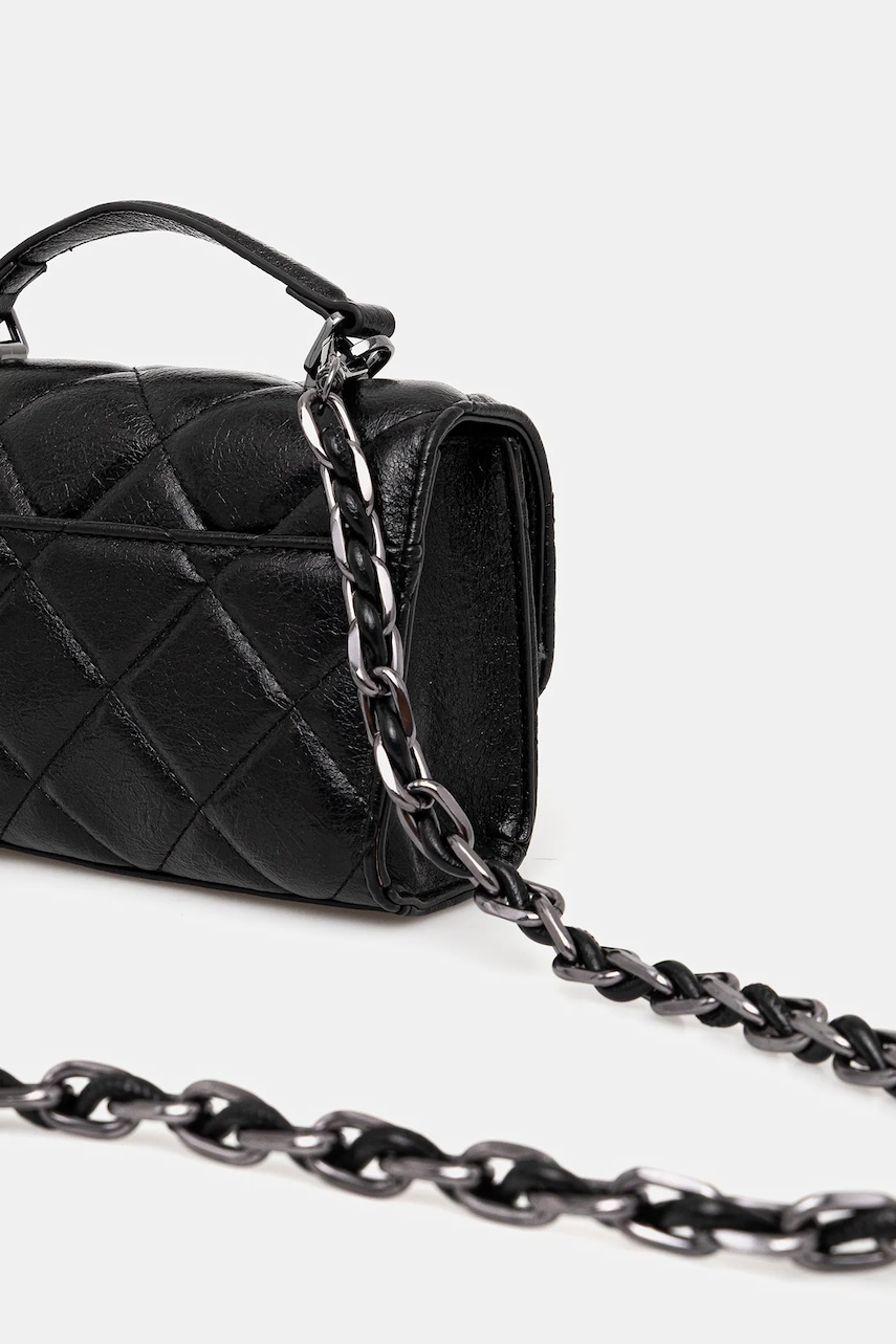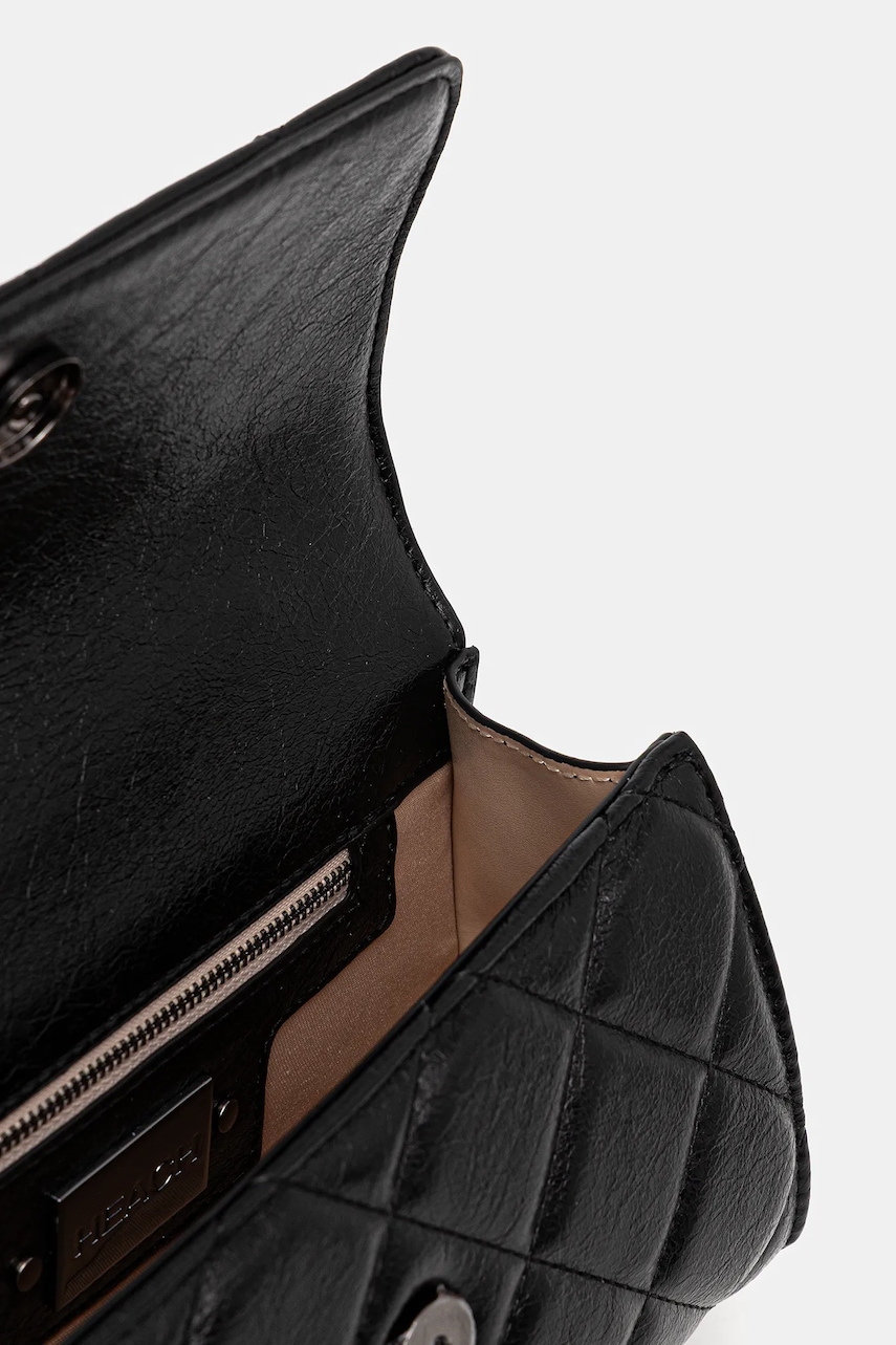 - Klapa zapinana na magnes. - Wewnętrzna, wsuwana kieszeń na telefon. - Kieszonka wewnętrzna zapinana na suwak. - Posiada uchwyty i odpinany pasek bez regulacji. - Nie mieści formatu A4. - Długość paska: 128 cm. - Głębokość: 7 cm. - Wysokość: 13 cm. - Szerokość u podstawy: 21 cm.