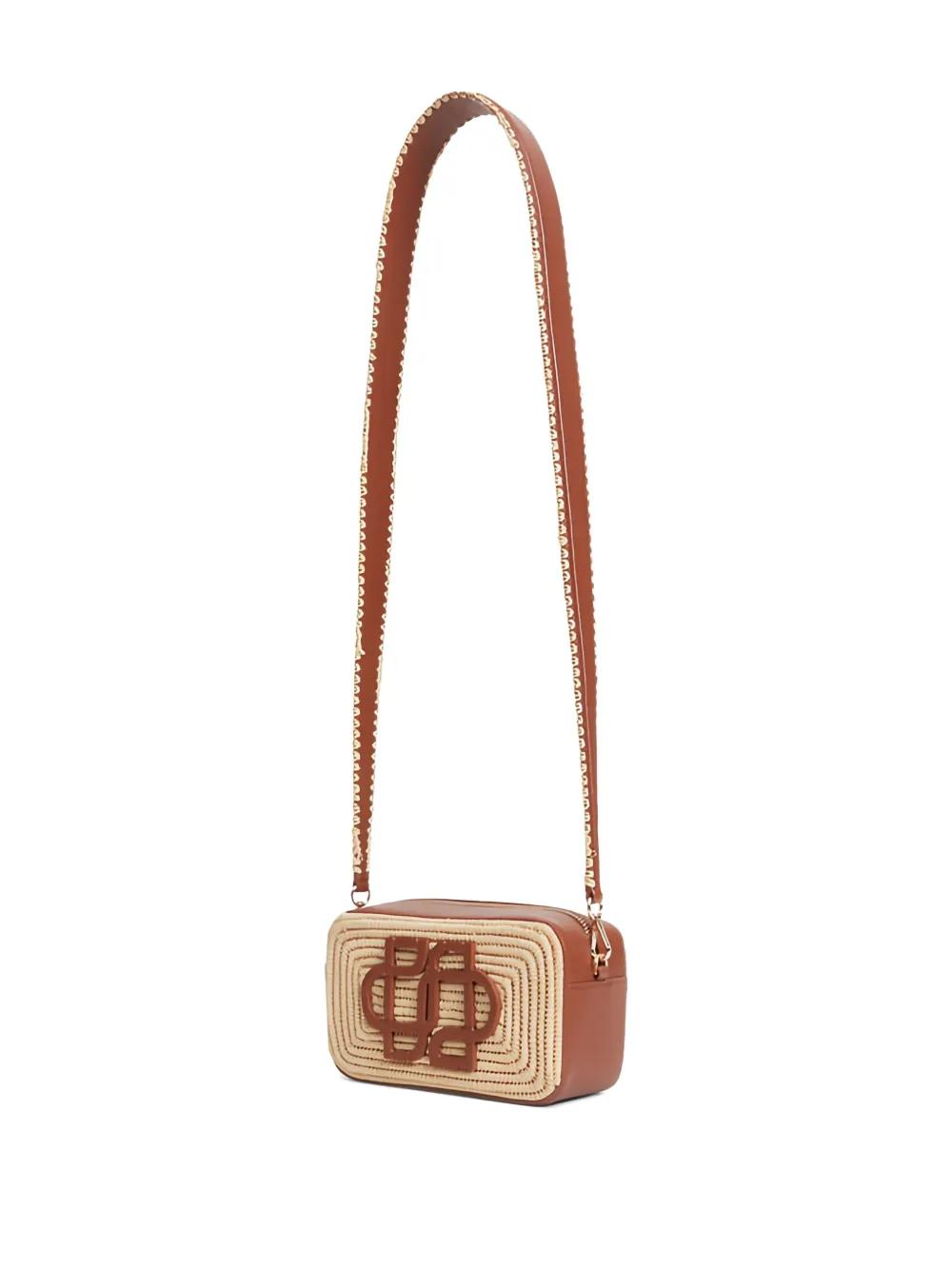 light brown raffia construction top zip fastening shoulder strap front logo detail