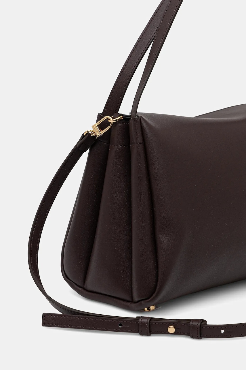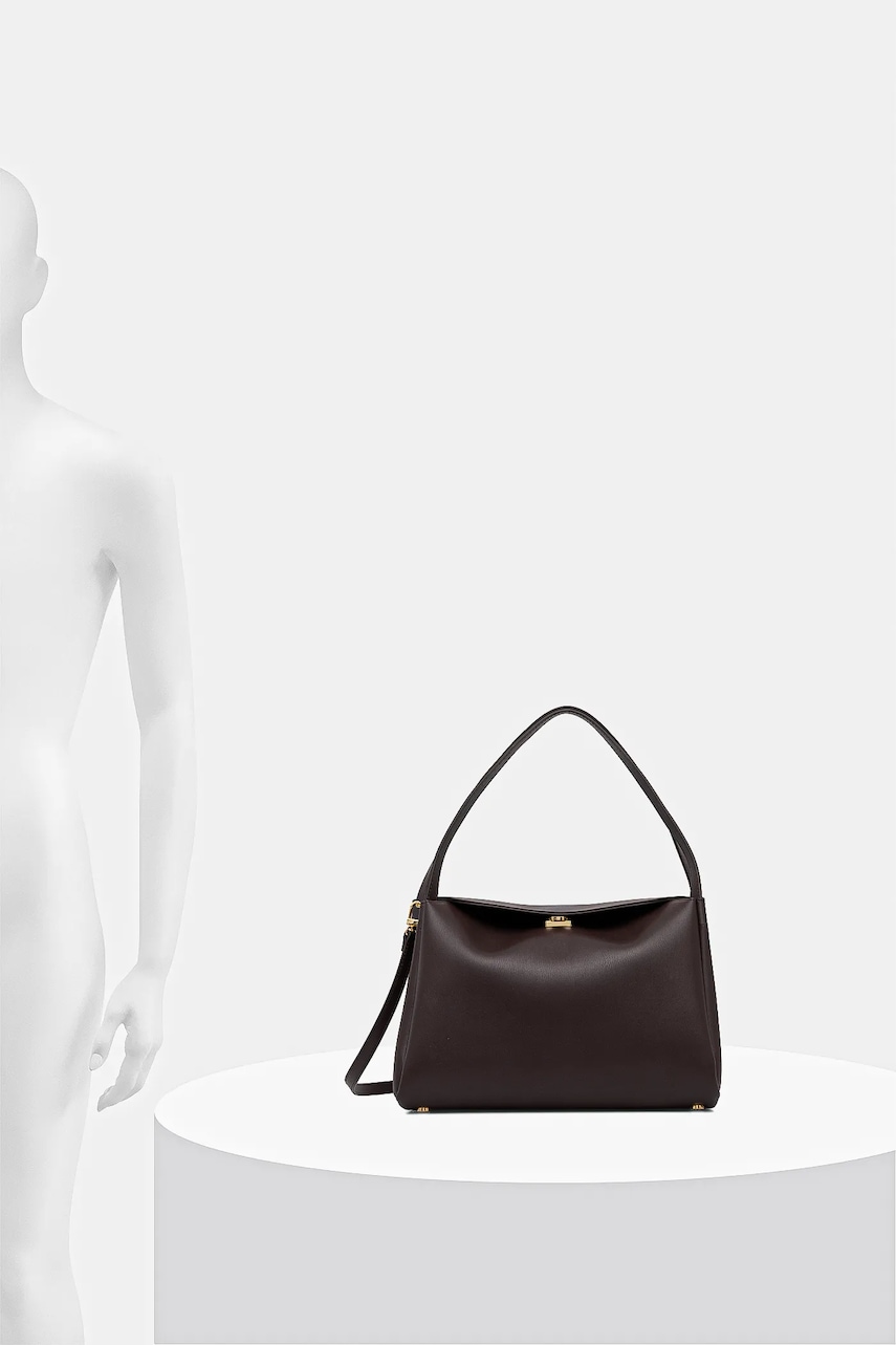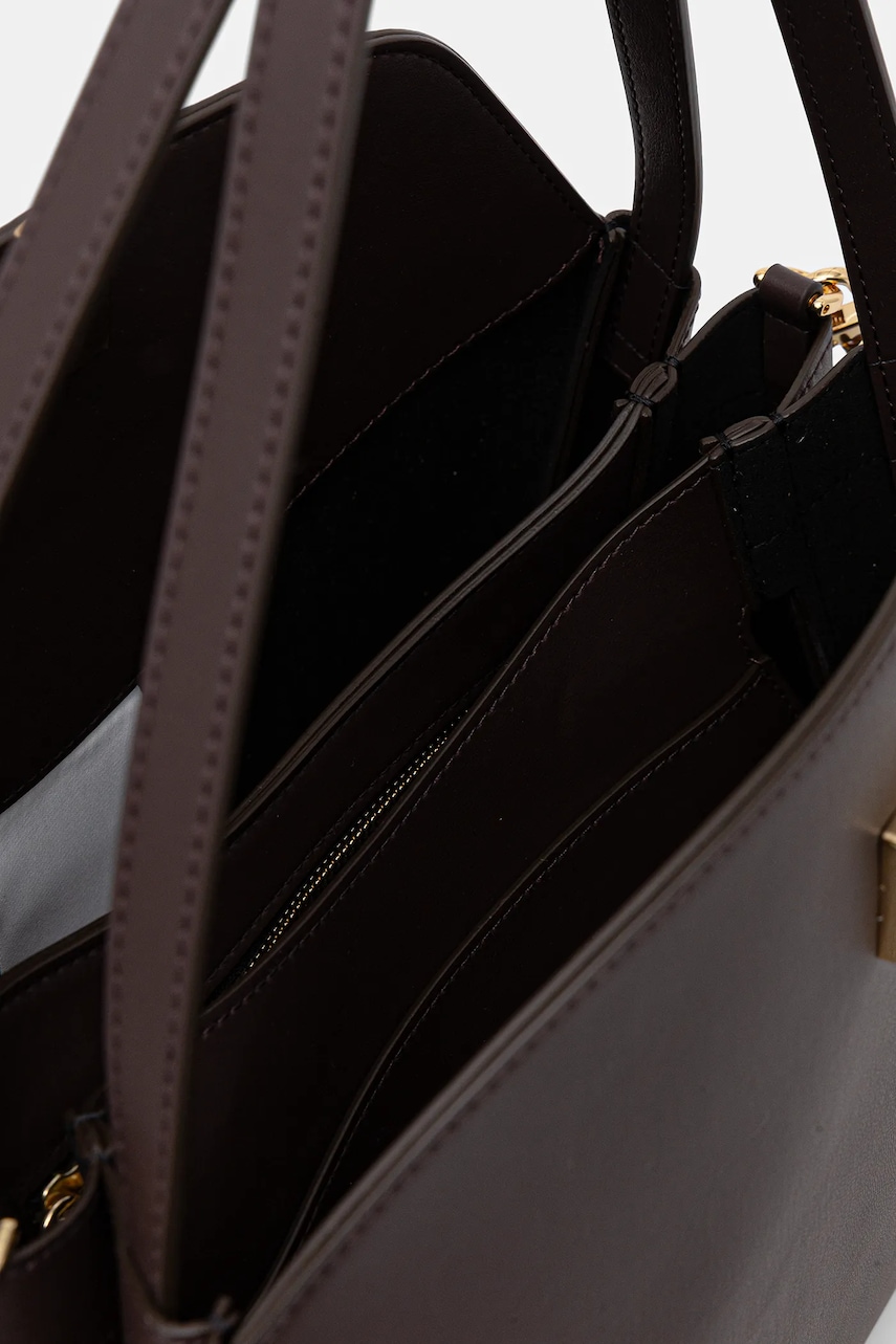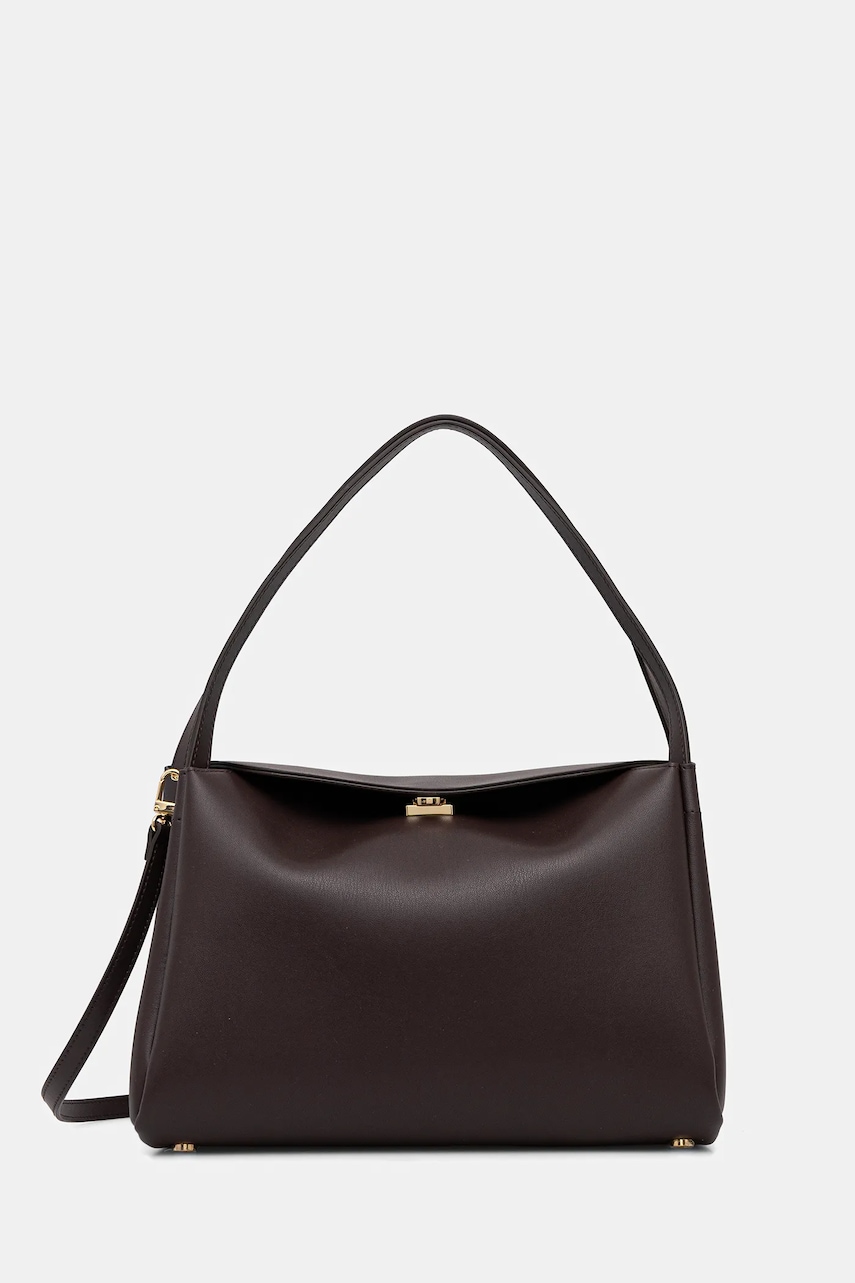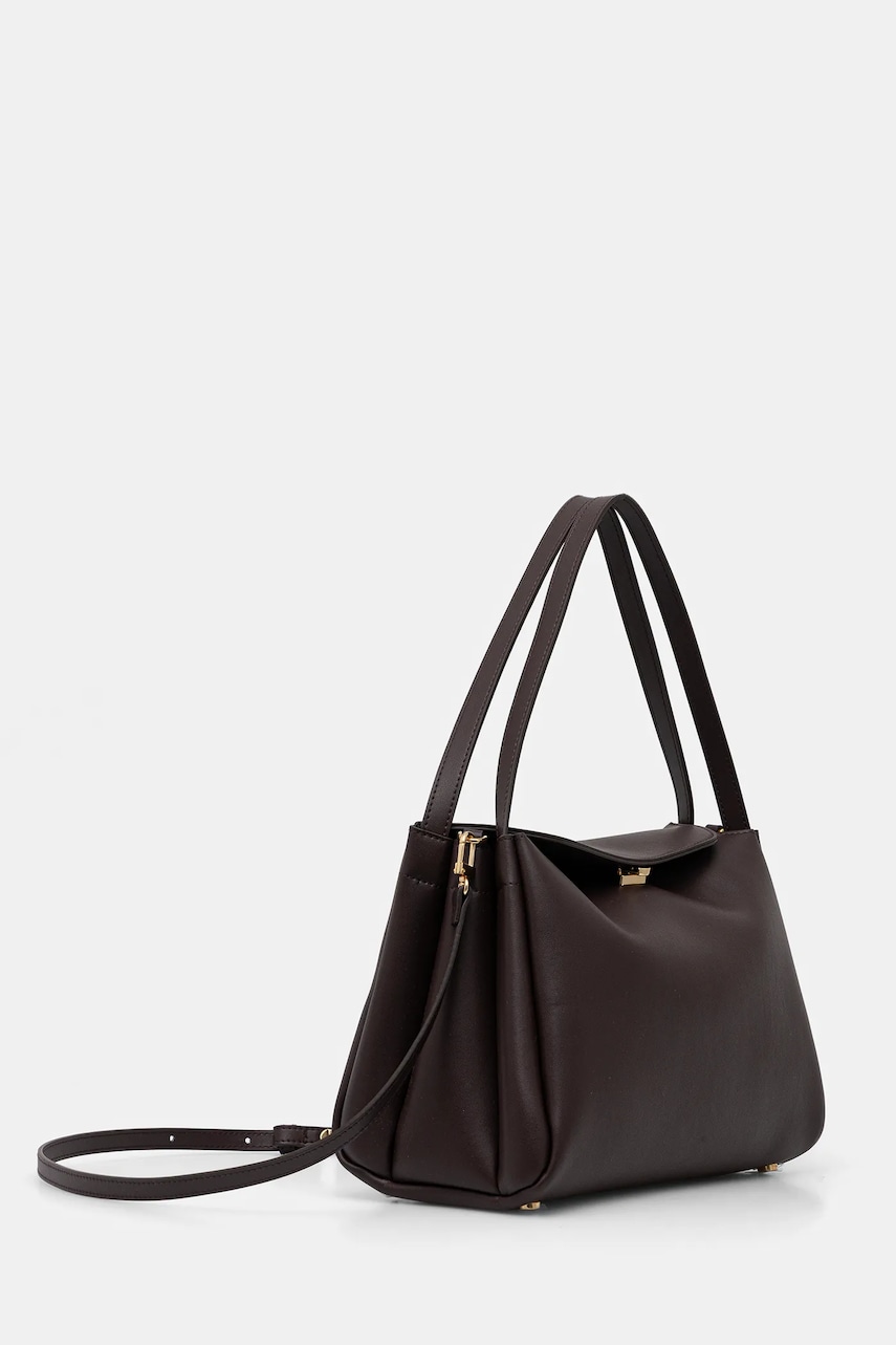 - Produkt zawiera materiały z włókien pochodzących z recyklingu. - Komora zapinana na magnes. - Posiada dwie przegrody. - Posiada dwie kieszenie wewenętrzne: jedna wsuwana, druga zapinana na suwak. - Model bez podszewki. - Nie mieści formatu A4. - Posiada uchwyty i odpinany pasek z regulacją. - Model wyposażony w metalowe nóżki, które zabezpieczają spód torebki. - Dołączony tekstylny worek zabezpiecza produkt przed kurzem. - Głębokość: 13 cm. - Wysokość: 20,5 cm. - Szerokość u podstawy: 29 cm. - Długość uchwytów: 48 cm. - Długość minimalna paska: 98 cm. - Długość maksymalna paska: 114 cm.