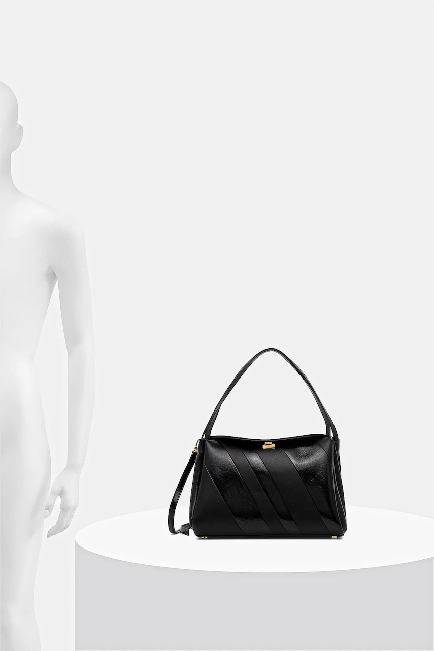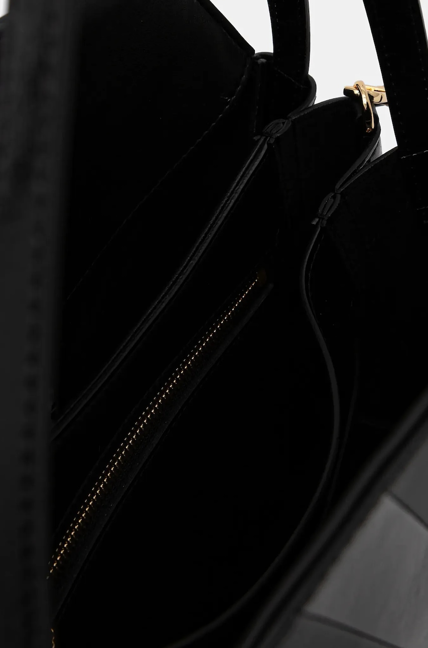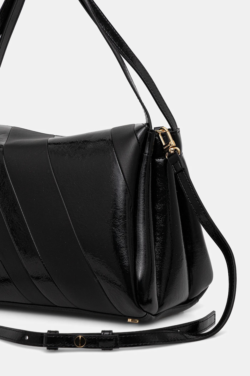 - Produkt zawiera materiały z włókien pochodzących z recyklingu. - Zapięcie na magnes. - Model bez podszewki. - Posiada dwie komory. - Posiada dwie kieszenie wewenętrzne: jedna wsuwana, druga zapinana na suwak. - Model wyposażony w metalowe nóżki, które zabezpieczają spód torebki. - Torebka do noszenia w ręku lub na ramieniu. - Posiada uchwyty i odpinany pasek z regulacją. - Nie mieści formatu A4. - Dołączony tekstylny worek zabezpiecza produkt przed kurzem. - Długość minimalna paska: 98 cm. - Długość maksymalna paska: 114 cm. - Długość uchwytów: 48 cm. - Głębokość: 13 cm. - Wysokość: 20,5 cm. - Szerokość u podstawy: 29 cm.