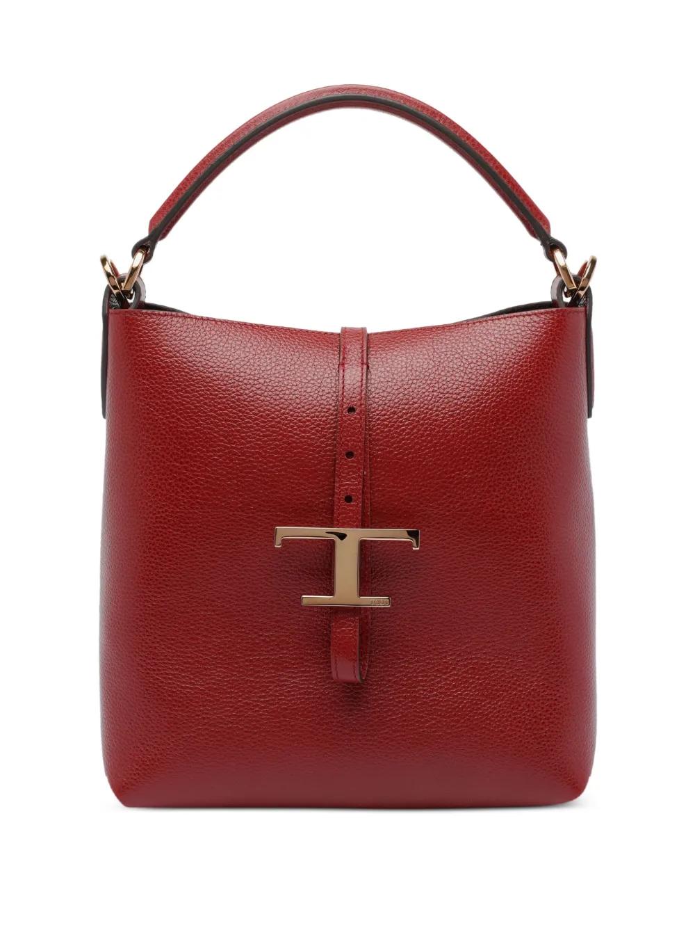 red calf leather top handle adjustable shoulder strap t-buckle fastening open inner pocket