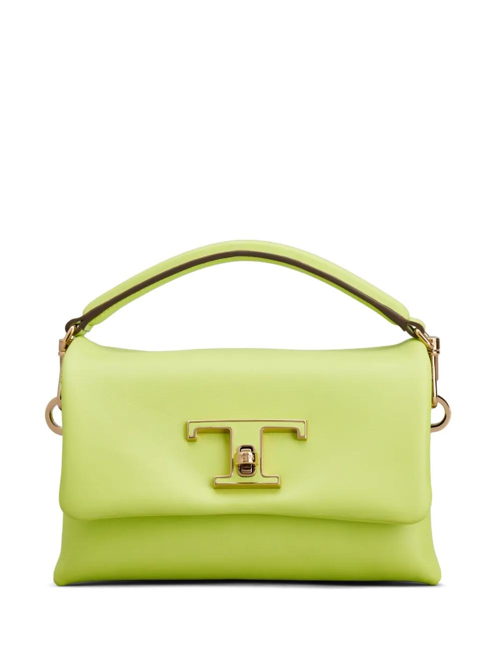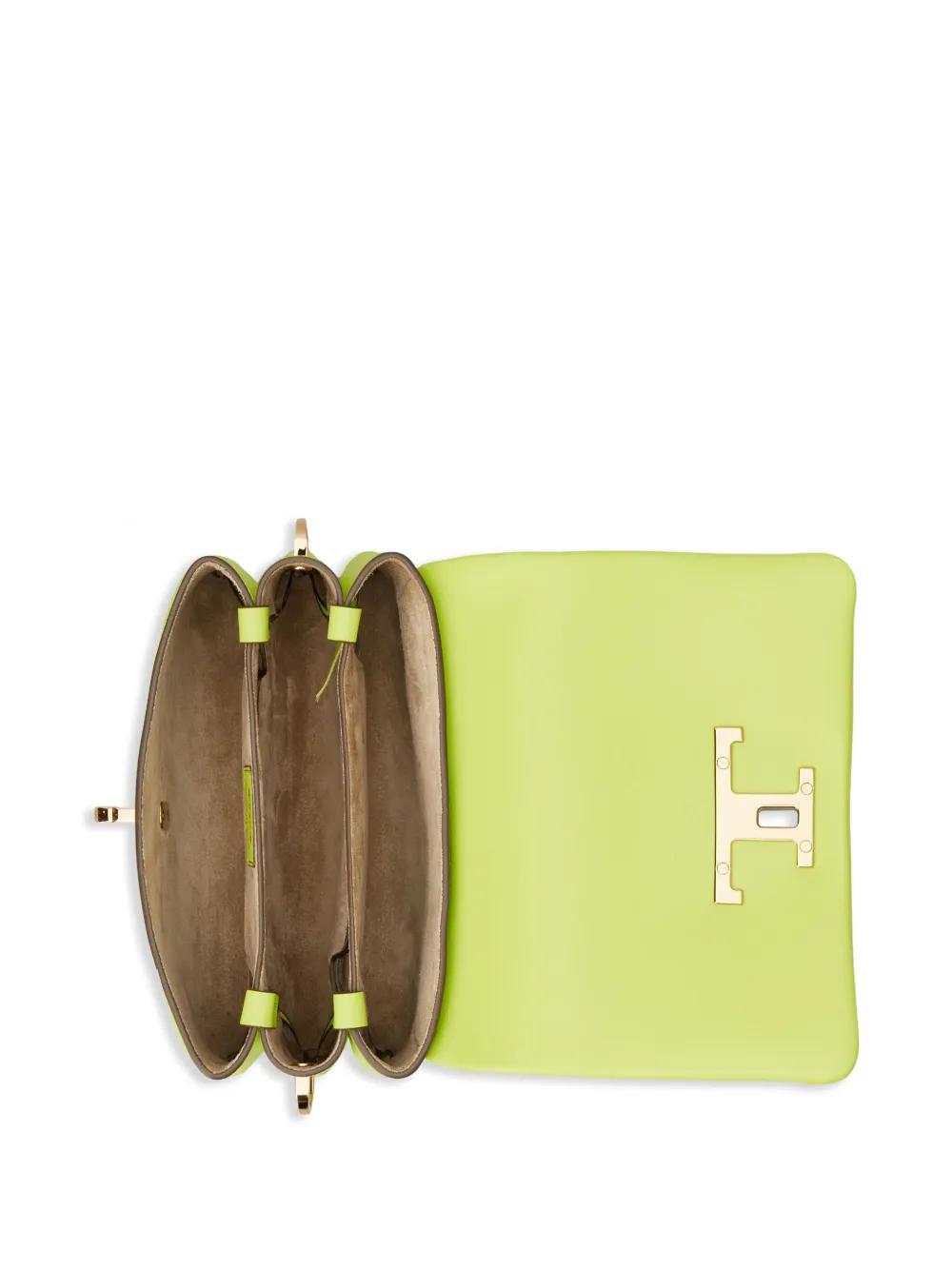 lime green leather padded design logo plaque twist-lock fastening foldover top partitioned compartment single detachable top handle adjustable detachable shoulder strap
