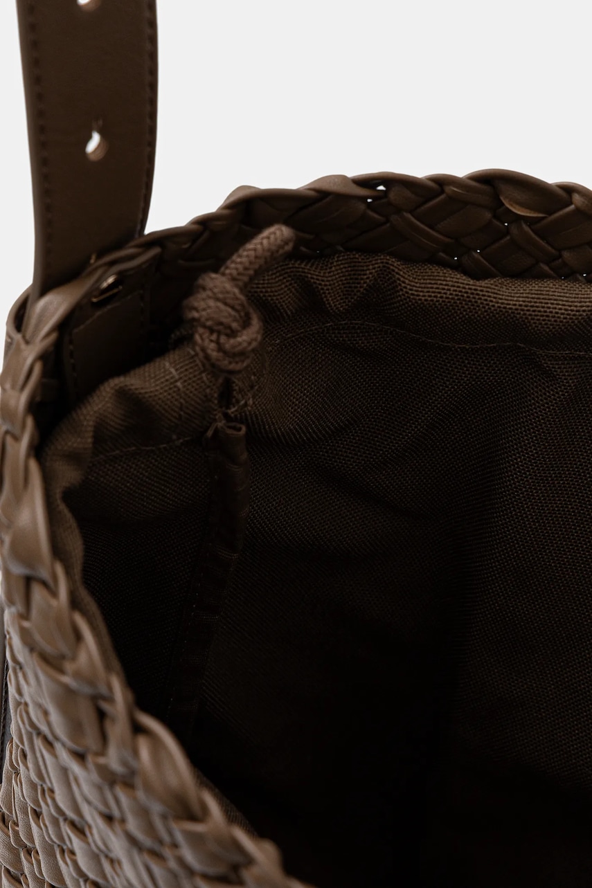 - Pasek z regulacją. - Model wykonany z plecionego materiału. - Wyjmowana komora, ściągana troczkami. - Mieści format A4. - Dołączony tekstylny worek zabezpiecza produkt przed kurzem. - Długość minimalna paska: 56 cm. - Długość maksymalna paska: 92 cm. - Głębokość: 12 cm. - Wysokość: 35 cm. - Szerokość u podstawy: 38 cm.